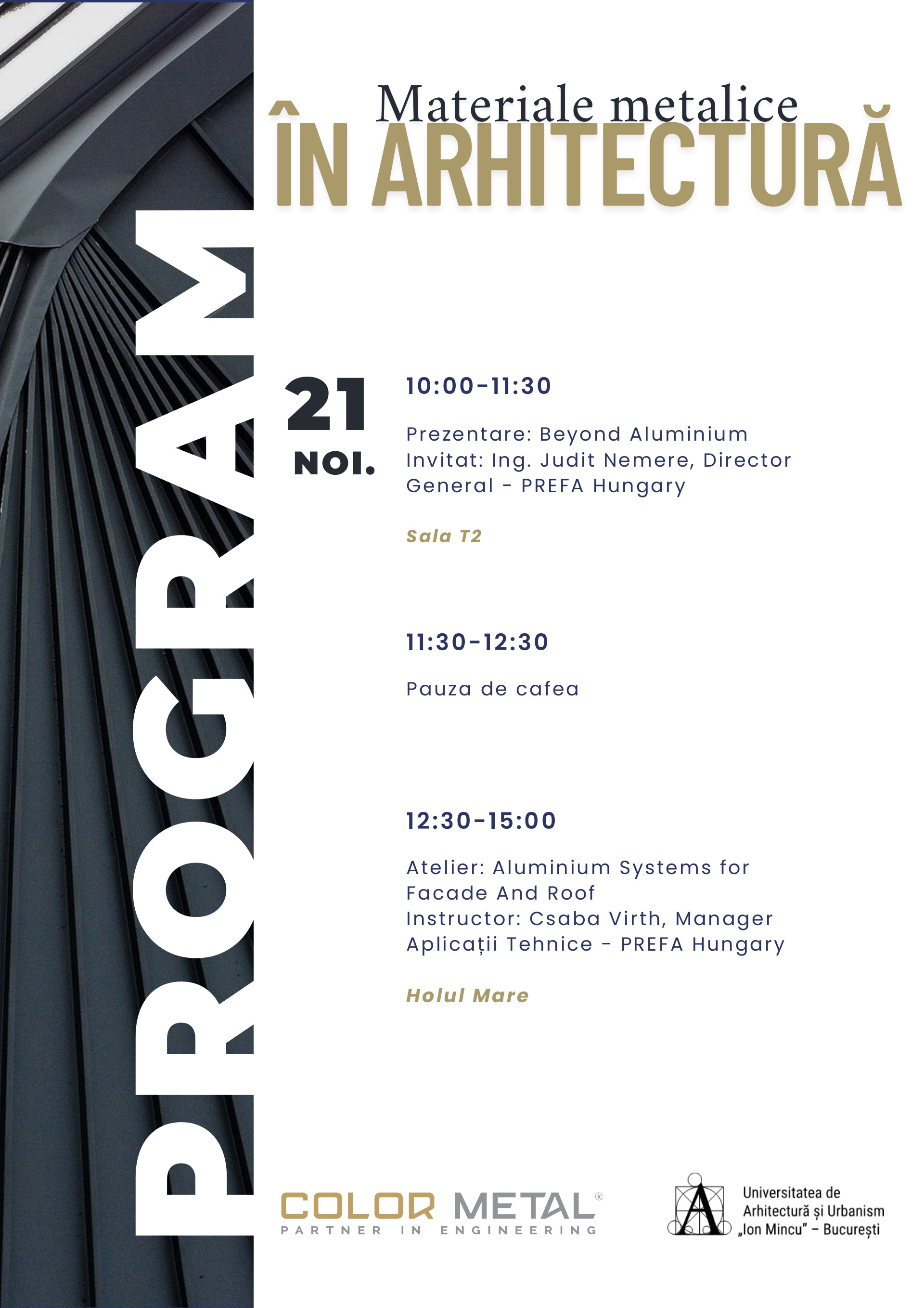 Departamentul de Științe Tehnice (UAUIM), în colaborare cu companiile Color Metal și PREFA, are plăcerea de a vă invita la cel de-al doilea eveniment dedicat prezentării și explorării aplicațiilor inovatoare ale materialelor metalice în arhitectură.