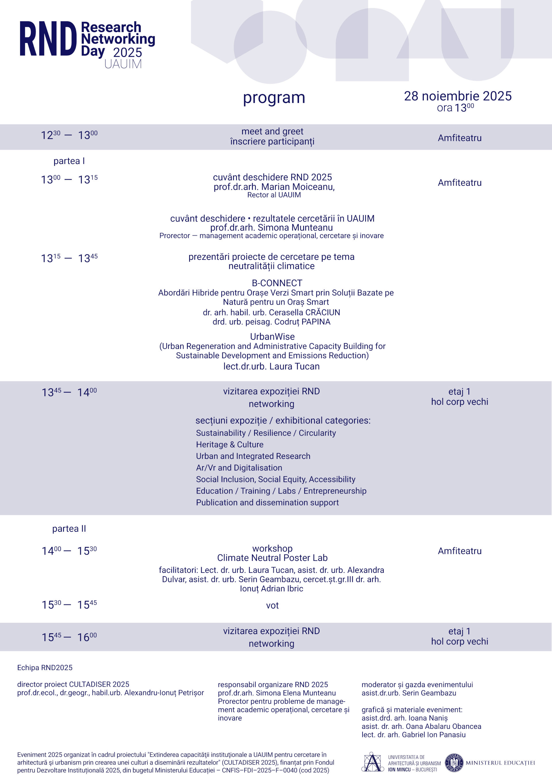 Research Networking Day este o zi dedicată dialogului și schimbului de cunoaștere, în care se vor prezenta și promova rezultatele cercetării din cadrul UAUIM — în urbanism, peisagistică, arhitectură și arhitectură de interior — și se va facilita interacțiunea cu instituții și organizații partenere. Scopul evenimentului este de a genera noi oportunități de colaborare și de a conecta cercetarea universitară cu nevoile și provocările contemporane ale mediului construit. Prin prezentări, discuții, o expoziție de proiecte, un workshop și un volum colectiv, RND 2025 va reflecta diversitatea temelor de cercetare derulate în cadrul UAUIM și va oferi un cadru deschis pentru împărtășirea preocupărilor comune și formularea unor direcții de viitor. Participanții vor avea ocazia de a crea noi relații de colaborare și de a identifica puncte de convergență între universități, instituții și companii interesate să dezvolte soluții creative, durabile și practice pentru provocările actuale și viitoare ale orașelor și mediului construit.