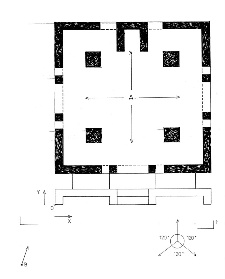 Se da planul unei machete din ipsos asezate pe o suprafata orizontala, reprezentand o constructie cu mai multe spatii. Singurul spatiu acoperit este cel central, marcat in plan cu (A). Grosimea acoperirii va fi egala cu grosimea peretilor. Inaltimea elementelor verticale (pereti, stalpi, coloane) precum si modul de acoperire a spatiului central vor fi propuse de catre candidat.