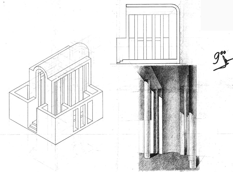 - reprezentare perspectiva a spatiului interior dupa directia marcata in plan (B) - valorata (umbre). Se va privi de la o cota egala cu circa 1/4 din inaltimea spatiului central masurata de la suprafata orizontala.