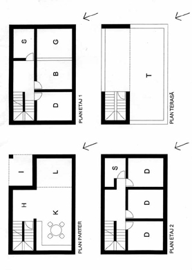 Desenele alăturate reprezintă planurile la scara 1:100 ale parterului, etajelor și terasei unei locuințe. Funcțiunile diferitelor spații sunt indicate prin litere, după cum urmează:I – zona de intrare, H – hol intrare, L – living, K – bucătărie și loc de luat masa, D – dormitor, B – birou,bibliotecă, G – gol peste living, S – grup sanitar, T – terasa. Clădirea este așezată pe sol, pe o suprafață orizontală. În planuri, zidurile secționate sunt înnegrite, inclusivcele exterioare (fațadele), în care nu au fost figurate golurile de uși și ferestre. Liniile punctate reprezintăconturul unor elemente situate deasupra liniei de secțiune. Având în vedere organizarea interioară afuncțiunilor, se cere:
