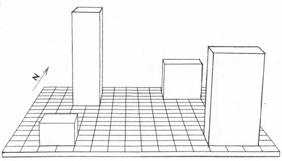 Se dau 4 volume așezate pe o suprafață plană, pe care este figurat un caroiaj alcătuit din pătrate cu latura de 7 x 7 m, dispuse câte 16 pe fiecare latură, ca în perspectiva de mai jos.