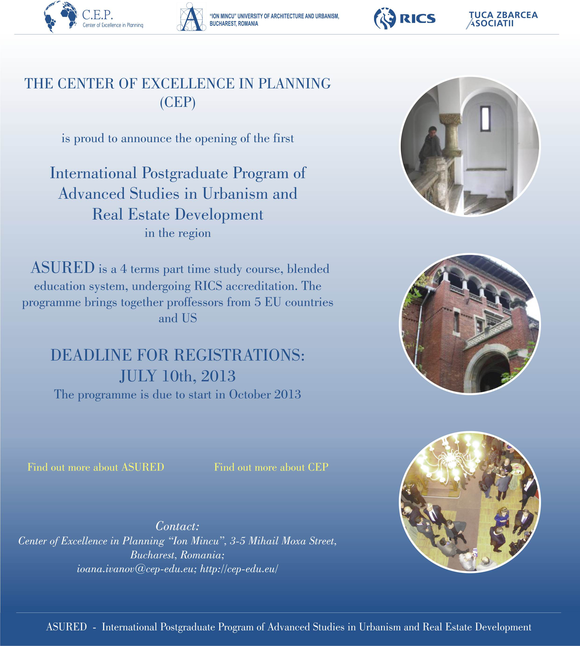 Centrul de Excelenta in Urbanism „Ion Mincu” (CEP)* anunta lansarea inscrierilor pentru Programul Postuniversitar International de Studii Avansate in Urbanism si Dezvoltare Imobiliara (ASURED - ”The International Postgraduate Program of Advanced Studies in Urbanism and Real Estate Development”). ASURED se inscrie in misiunea CEP de a promova pe plan international planificarea urbana de excelenta din Romania, contribuind la constituirea unui hub pentru zona Europei Centrale si de Est.