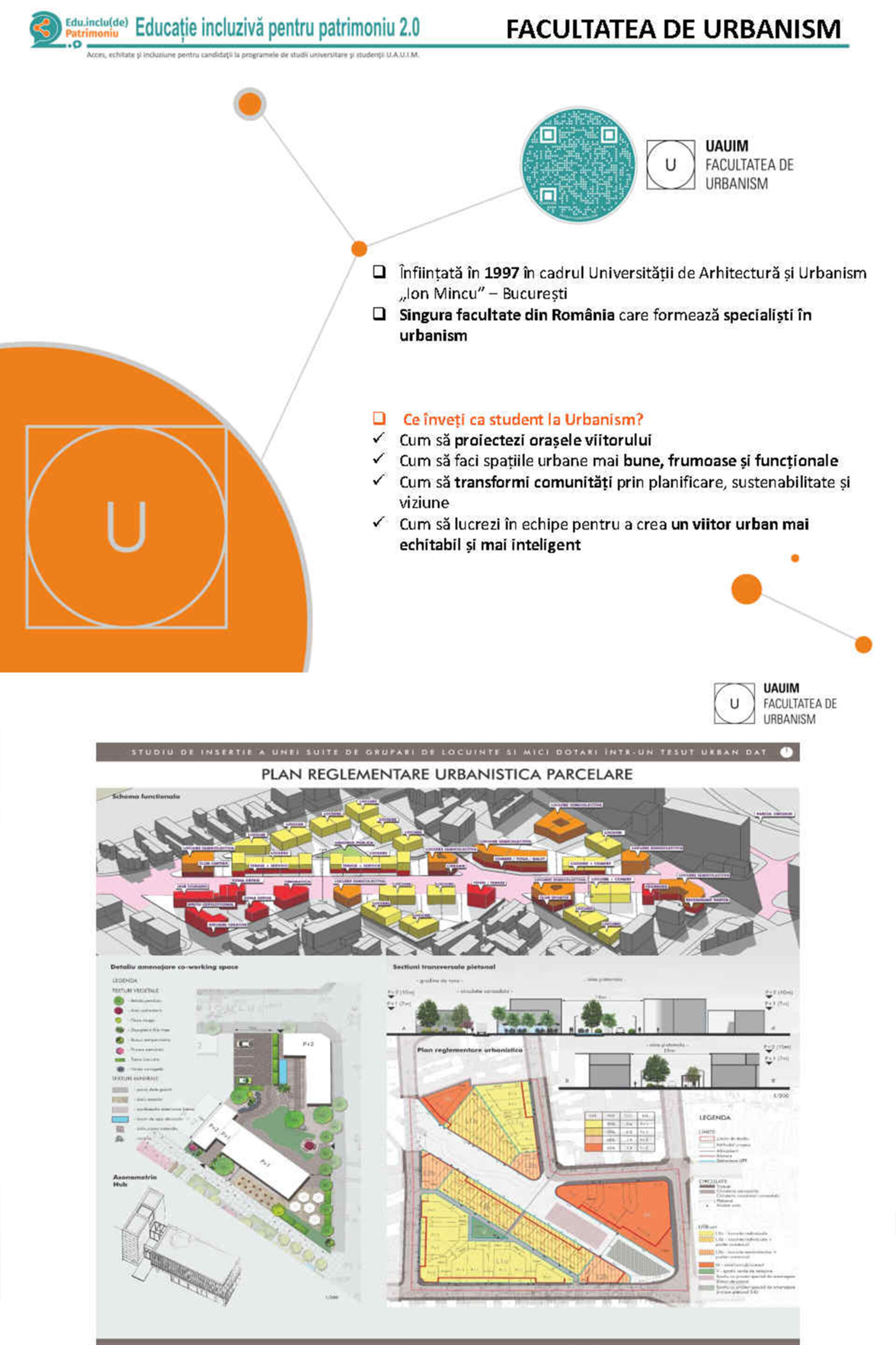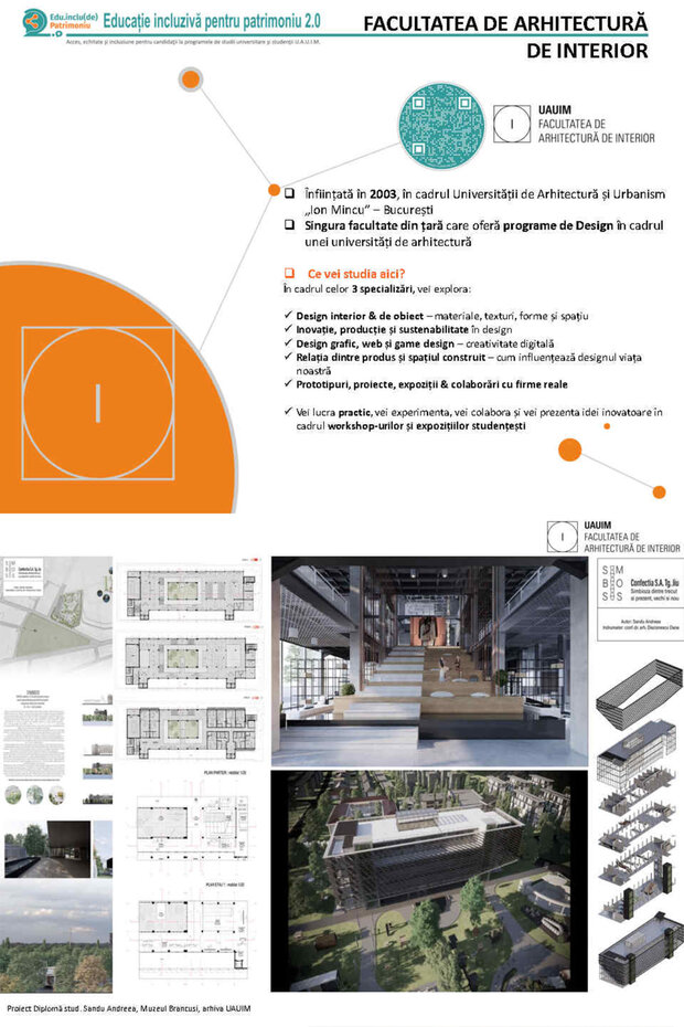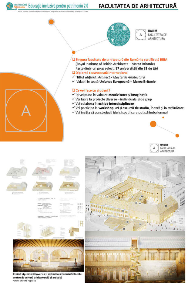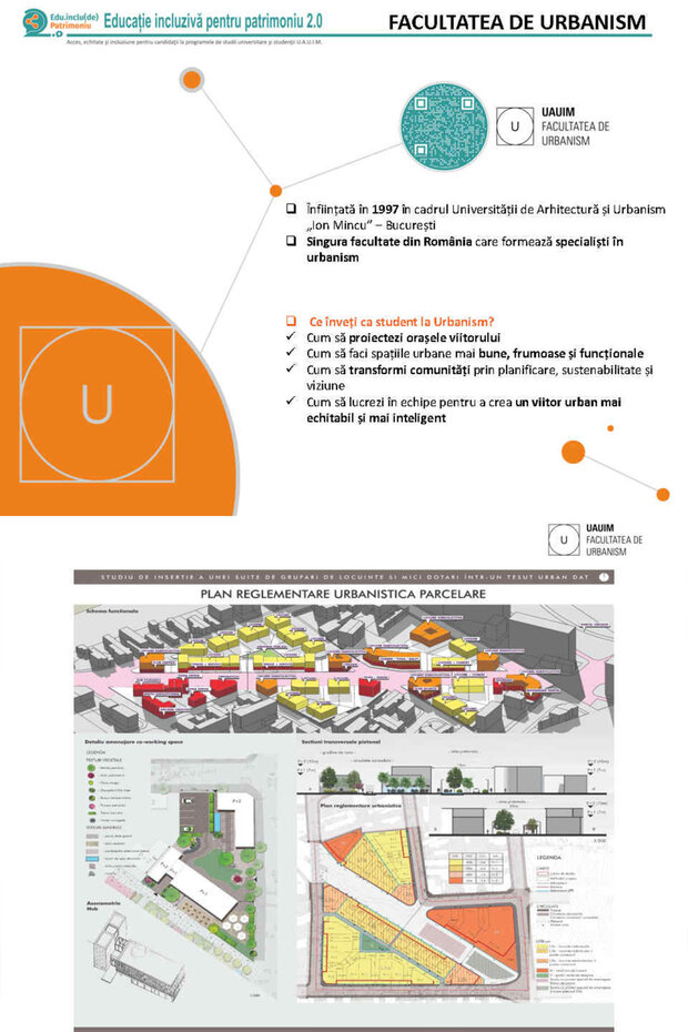 Universitatea de Arhitectură și Urbanism „Ion Mincu”, prin proiectul Educație incluzivă pentru patrimoniu - Acces, echitate și incluziune pentru candidații la programele de studii universitare și studenții Universității de Arhitectură și Urbanism „Ion Mincu”, acronim EduInclu(de)Patrimo 2.0, finanțat CNFIS-FDI-2025-F-0157, desfășoară activități care au drept scop asigurarea accesului liceenilor din zonele rurale/mic urbane la oferta educațională, consiliere profesională și vocațională, mentorat și lecții introductive/demonstrative, în vederea încurajării admiterii la UAUIM, cât și sprijinirea studenților universității prin oferirea de servicii consiliere adaptate nevoilor lor, pentru creșterea echității sociale, a incluziunii sociale și a sporirii accesului la învățământ superior.