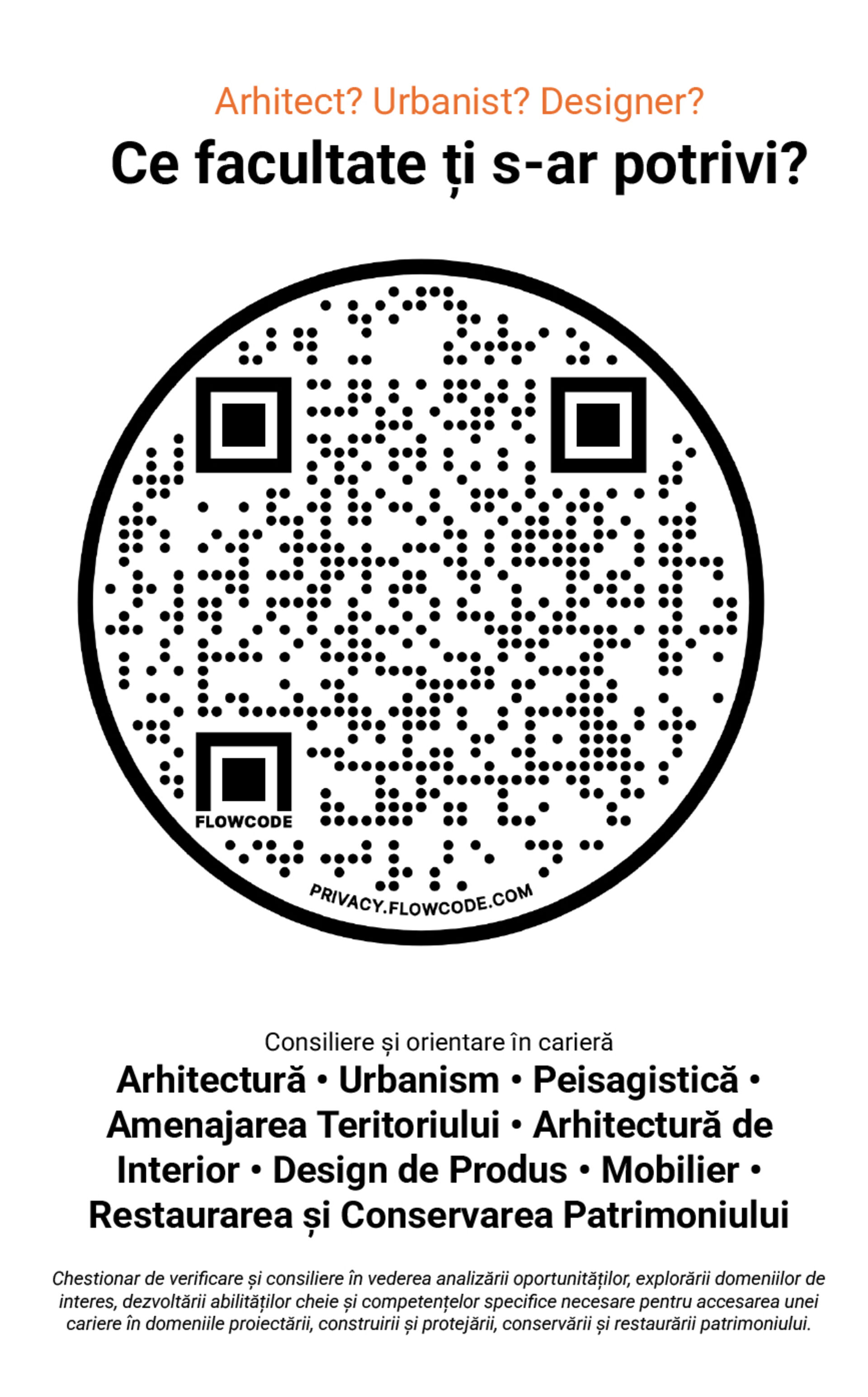 A.3. Organizarea a min. 2 seminarii de orientare și consiliere profesională – lecții introductive/demonstrative în vederea admiterii la facultățile UAUIM, adresate celor interesați, realizate fizic/online, în vederea îndrumării elevilor provenind din mediile defavorizate către învățământul superior, pentru a facilita tranziția către învățământul universitar în domeniul arhitecturii, designului, al conservării-restaurării de arhitectură, al urbanismului și al amenajării teritoriului.