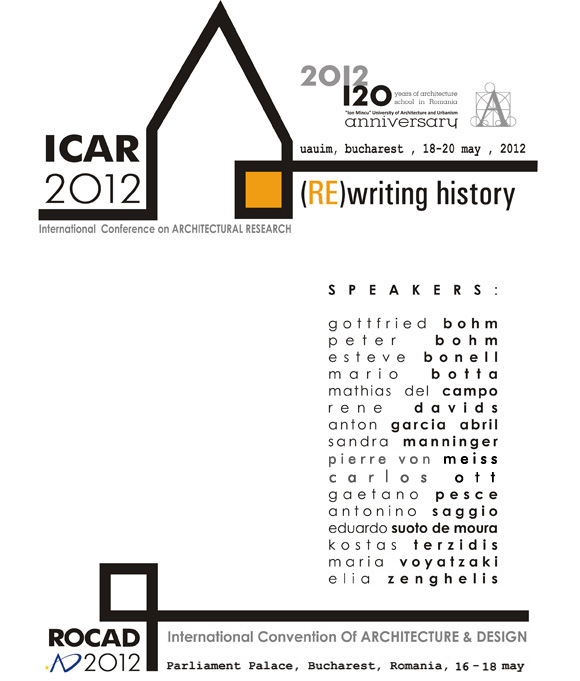 Cele două evenimente: ROCAD - Romanian Convention of Architecture and Design între 16-18 mai 2012 și ICAR - International Conference on Architectural Research între 18-20 mai 2012, reunesc la Palatul Parlamentului și la Universitatea de Arhitectură și Urbanism "Ion Mincu" (UAUIM), pe de o parte invitați de prestigiu internațional și cu o valoroasă carieră - practicieni, teoreticieni, profesori - pentru a ne împărtăși din experiența lor și pe de altă parte comunitatea academică internațională preocupată de cercetarea în arhitectură.