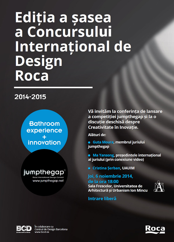 Te asteptam sa discutam despre creativitate, experiente, inovatii si multe alte lucruri interesante pentru arhitecti si designeri! Pentru prima dată în România, Roca anunță oficial startul competiției internaționale de design jumpthegap printr-o conferință care va avea la Universitatea de Arhitectură și Urbanism Ion Mincu, în Sala Frescelor, pe 6 noiembrie, începând cu ora 18.00.