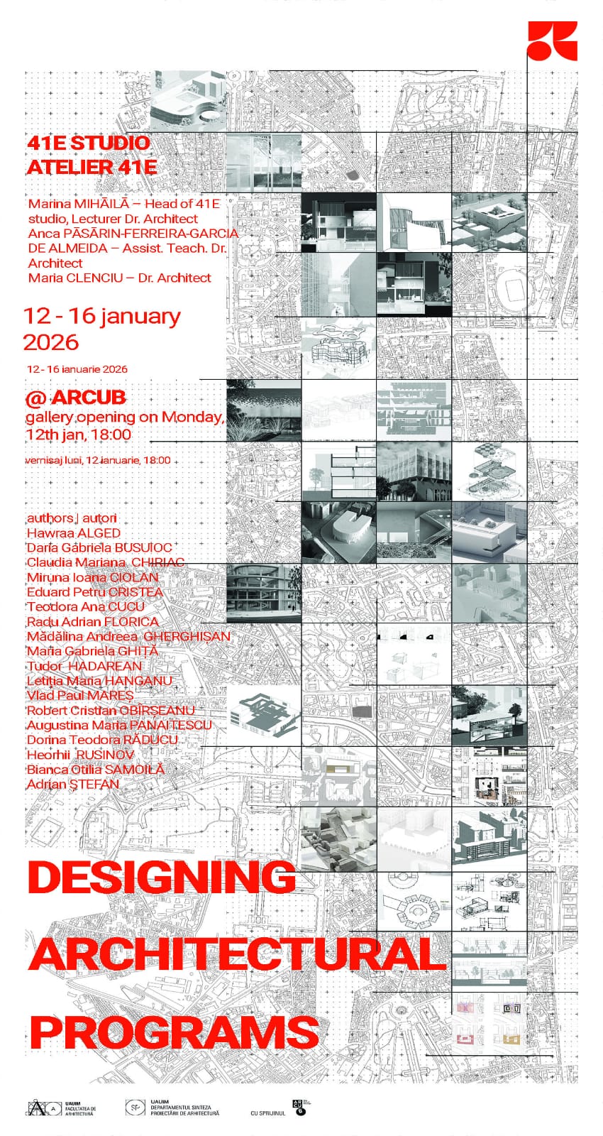 Studenții noștri vă invită - alaturi de cadrele didactice ale atelierului 41E - la expoziția proiectelor din semestrul 1, an universitar 2025-2026 Designing Architectural Programs: 12-16 ianuarie 2026.
