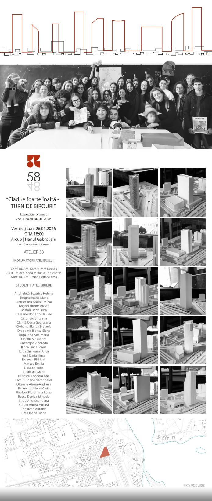 Atelier.58 propune, în perioada 26–30 ianuarie 2026, o expoziție de proiecte centrată pe tema clădirii foarte înalte, cu accent pe tipologia turnului de birouri. Demersul urmărește investigarea critică a rolului pe care arhitectura verticală îl poate avea în structura și imaginea orașului contemporan: de la relația cu țesutul urban și spațiul public, până la articularea programului, logica structurală, performanța anvelopei și expresia volumetrică.