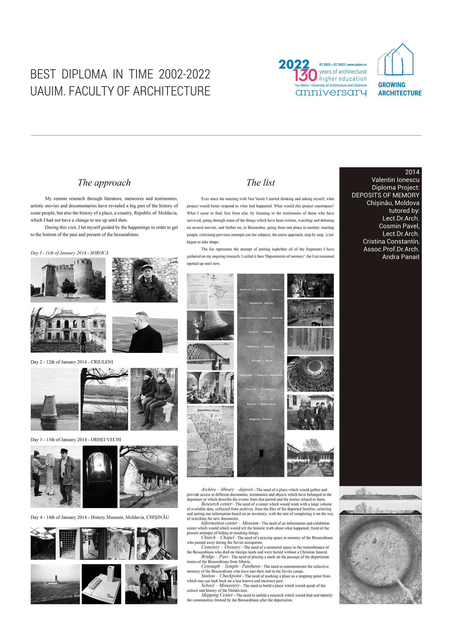 Expoziția “Best Diploma In Time 2002-2022 UAUIM. Faculty of Architecture” ilustrează, într-o serie de 24 de proiecte selectate, ultimii 21 de ani de tradiție în educație, inovație în construirea dialogului & rezultatelor spațiului academic, și asigurarea continuității pentru practica de arhitectură. Expoziția prezintă arhitecți absolvenți ai Facultății de Arhitectură – UAUIM București, idei de concepere a noilor programme de arhitectură, și profesori-arhitecți care au inspirat și susținut activitatea de îndrumare a proiectelor de diplomă.