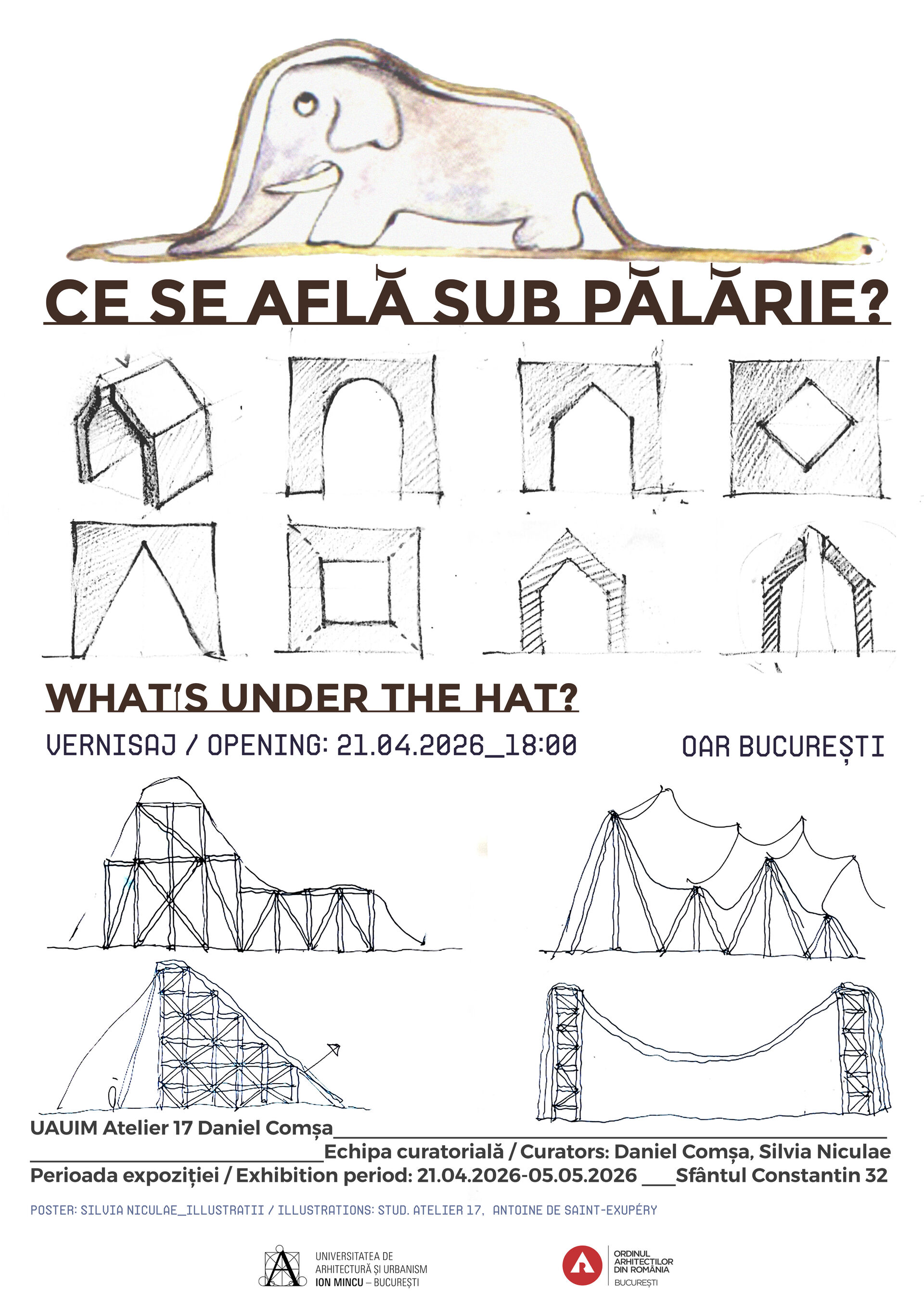 „Ce se află sub pălărie” este o metaforă care interpretează elefantul înghițit de șarpe din ,,Micul Prinț’’ al lui Antoine de Saint-Exupéry și dorește să dea un nou sens unui exercițiu structural, creând și o posibilitate de surpriză dată de un gest aproape magic al ridicării pălăriei și al dezvăluirii unui nou strat, care poate să fie neașteptat. Expoziția urmărește aceste interpretări, realizate de studenții grupei 17 UAUIM.