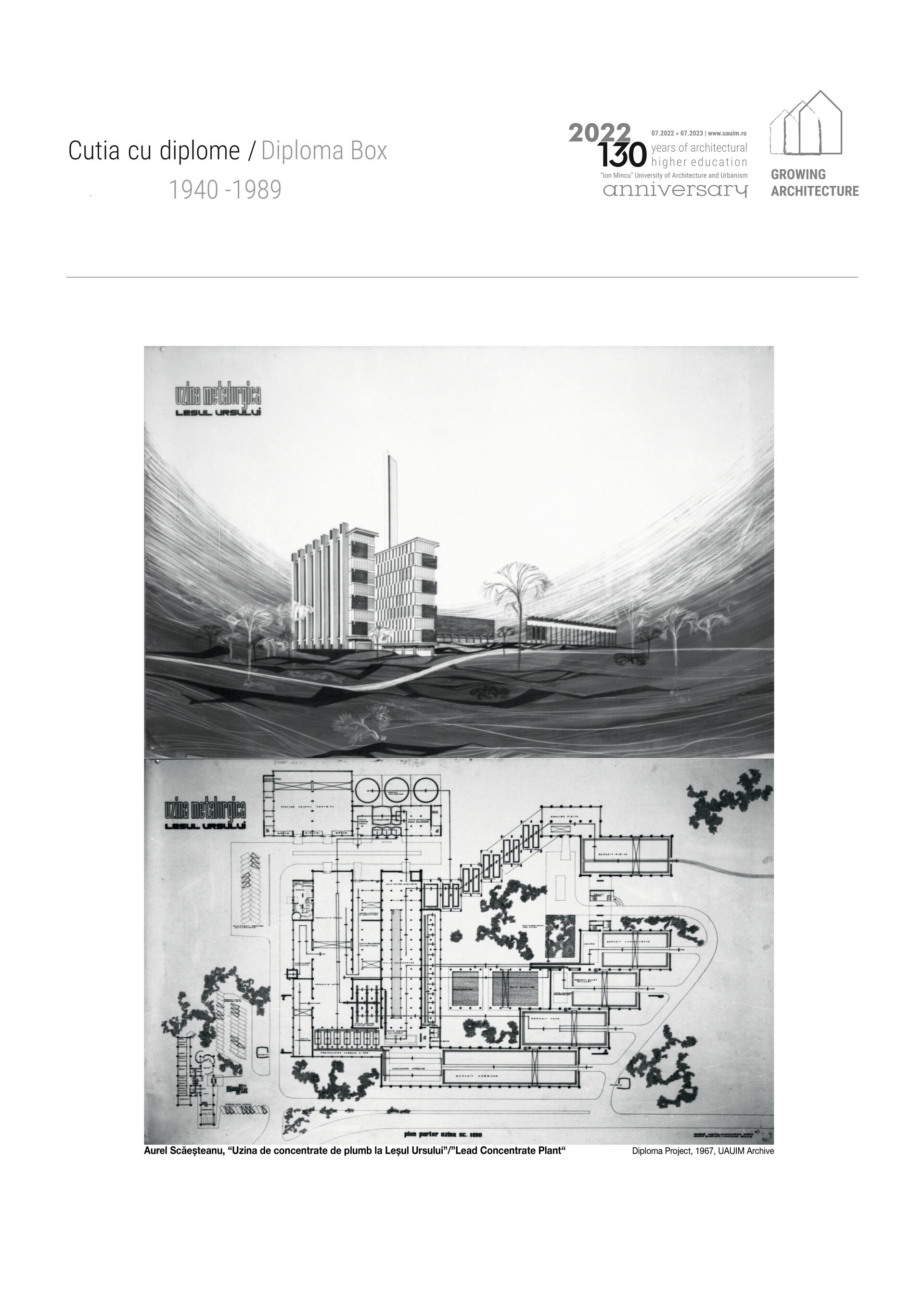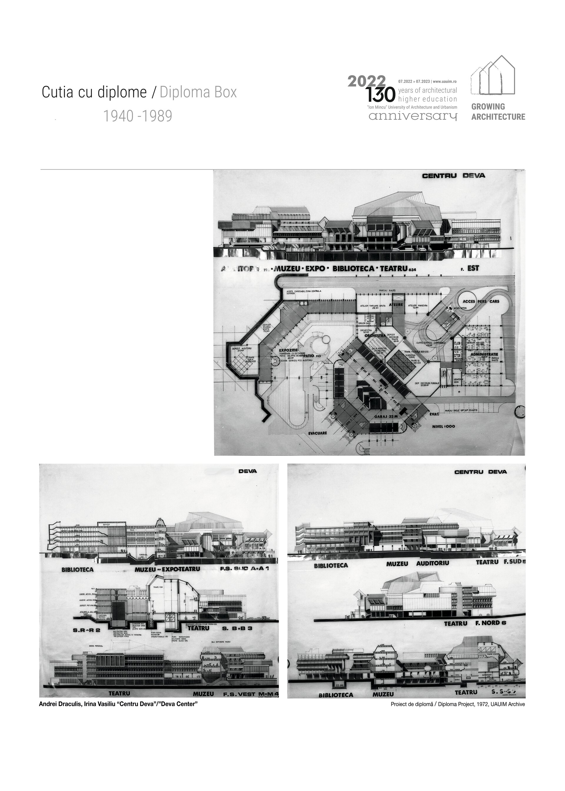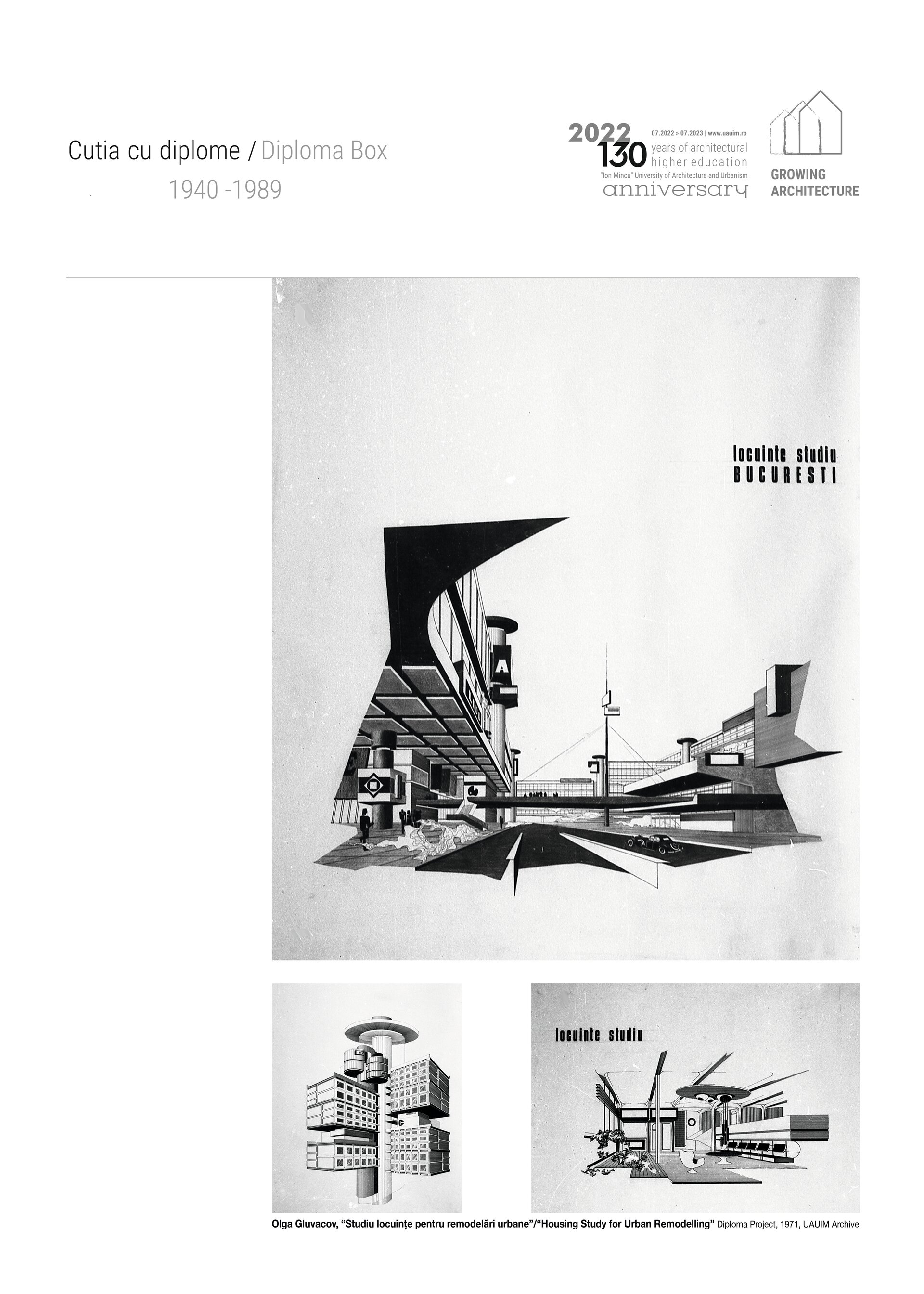 Expoziția prezintă extrase din cartea „Cutia cu diplome”. Studiul face parte dintr-o serie de cercetări ale Școlii românești de arhitectură de la București, concentrându-se asupra proiectelor de diplomă elaborate în perioada 1944-1989. Cartea include 86 de proiecte ale celor mai buni absolvenți arhitecți, din perioada comunistă, studenți care au devenit ulterior profesioniști de prestigiu ai breslei.