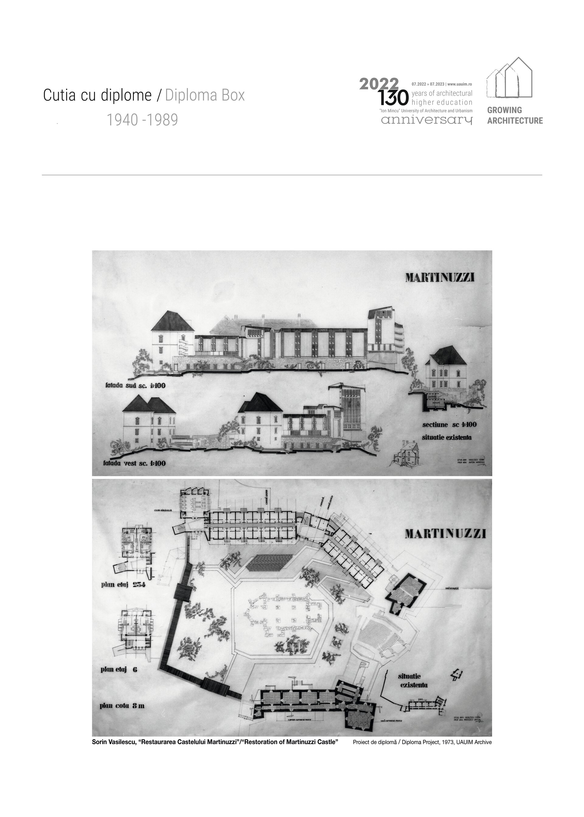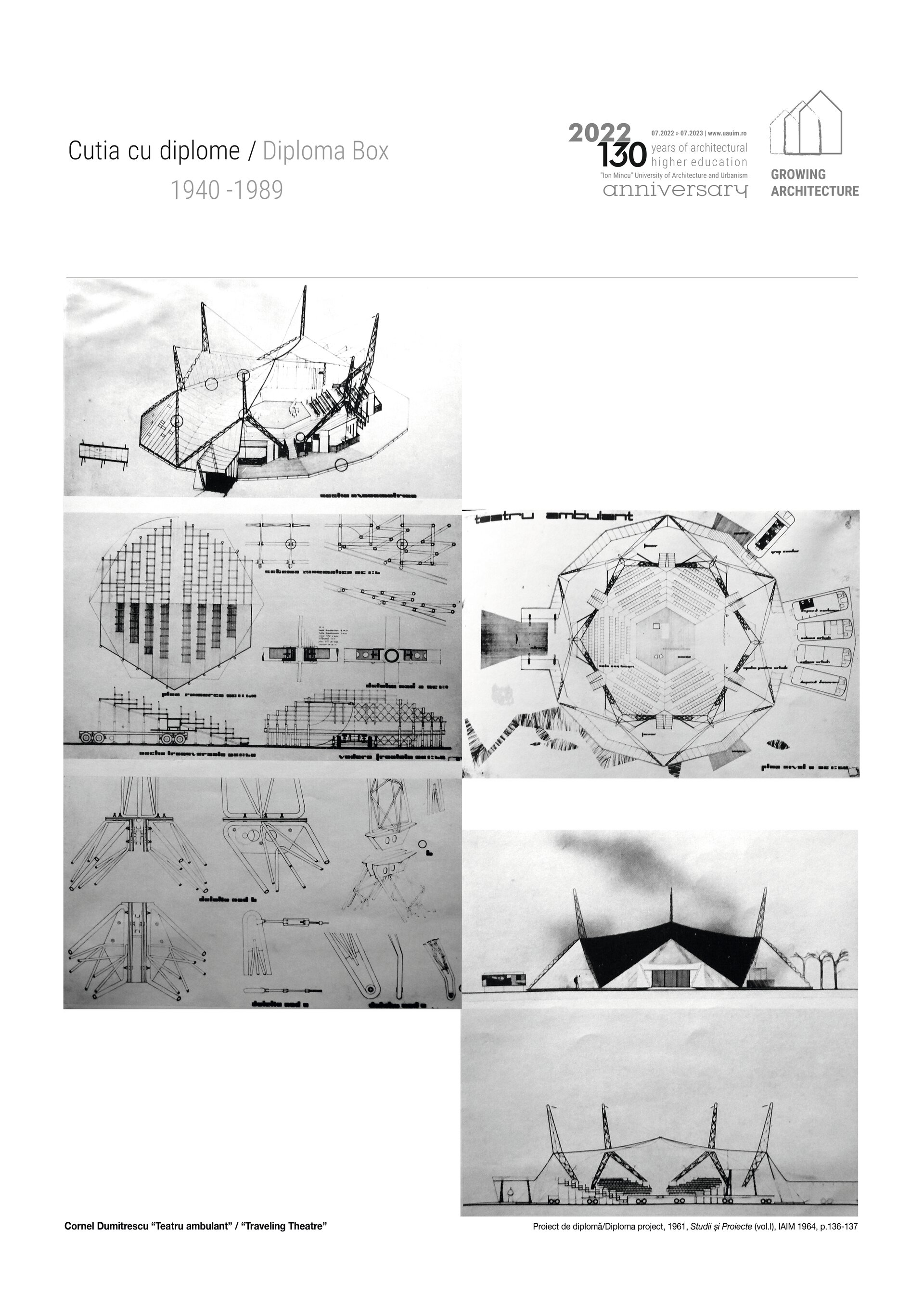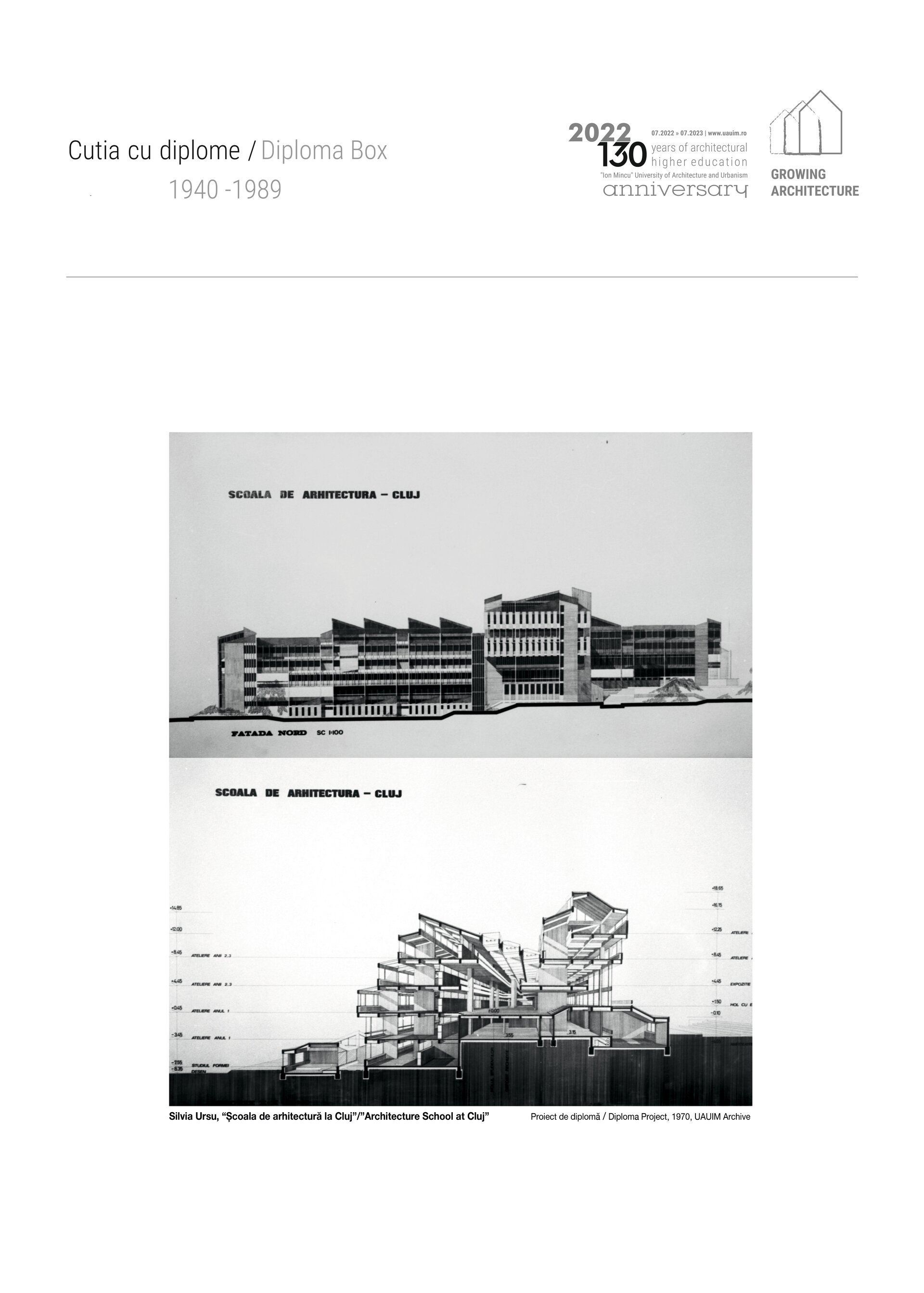 Expoziția prezintă extrase din cartea „Cutia cu diplome”. Studiul face parte dintr-o serie de cercetări ale Școlii românești de arhitectură de la București, concentrându-se asupra proiectelor de diplomă elaborate în perioada 1944-1989. Cartea include 86 de proiecte ale celor mai buni absolvenți arhitecți, din perioada comunistă, studenți care au devenit ulterior profesioniști de prestigiu ai breslei.