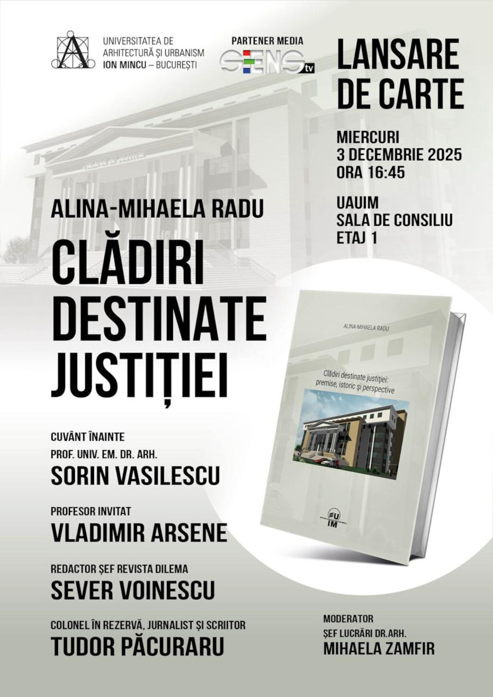 Sunt invitați să participe colegii din UAUIM – studenți, cadre didactice, personal academic și toți cei care susțin acest demers intelectual – pentru a celebra împreună apariția unei contribuții importante la studiul arhitecturii destinate justiției.