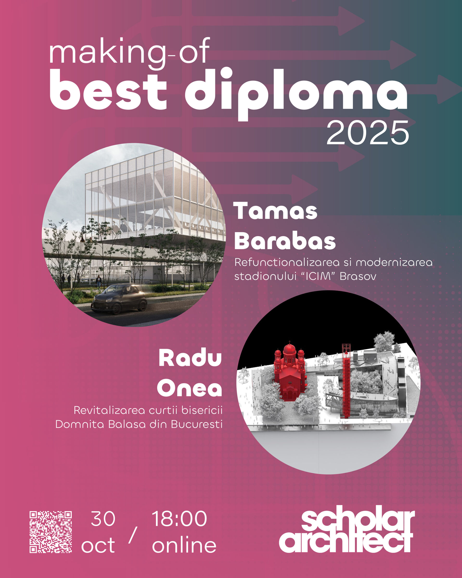 Pentru prima întâlnire îi avem ca invitați pe Tomas Barabas și Radu Onea, alaturi de care vom intra în „culisele” proiectelor lor de diploma, de la concept, până la predarea finala și jurizare.