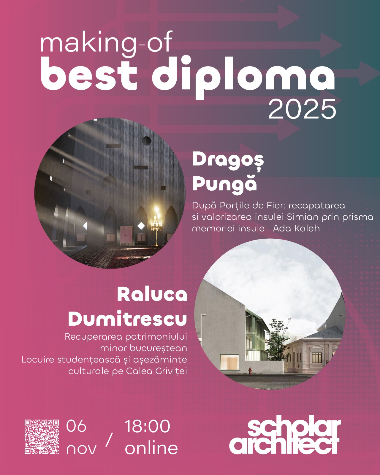 Dragos Punga si Raluca Dumitrescu vor povesti din culisele proiectelor lor de diplomă, ambele centrate în jurul unor cuvinte cheie precum memorie, recuperare, valorizare și patrimoniu.