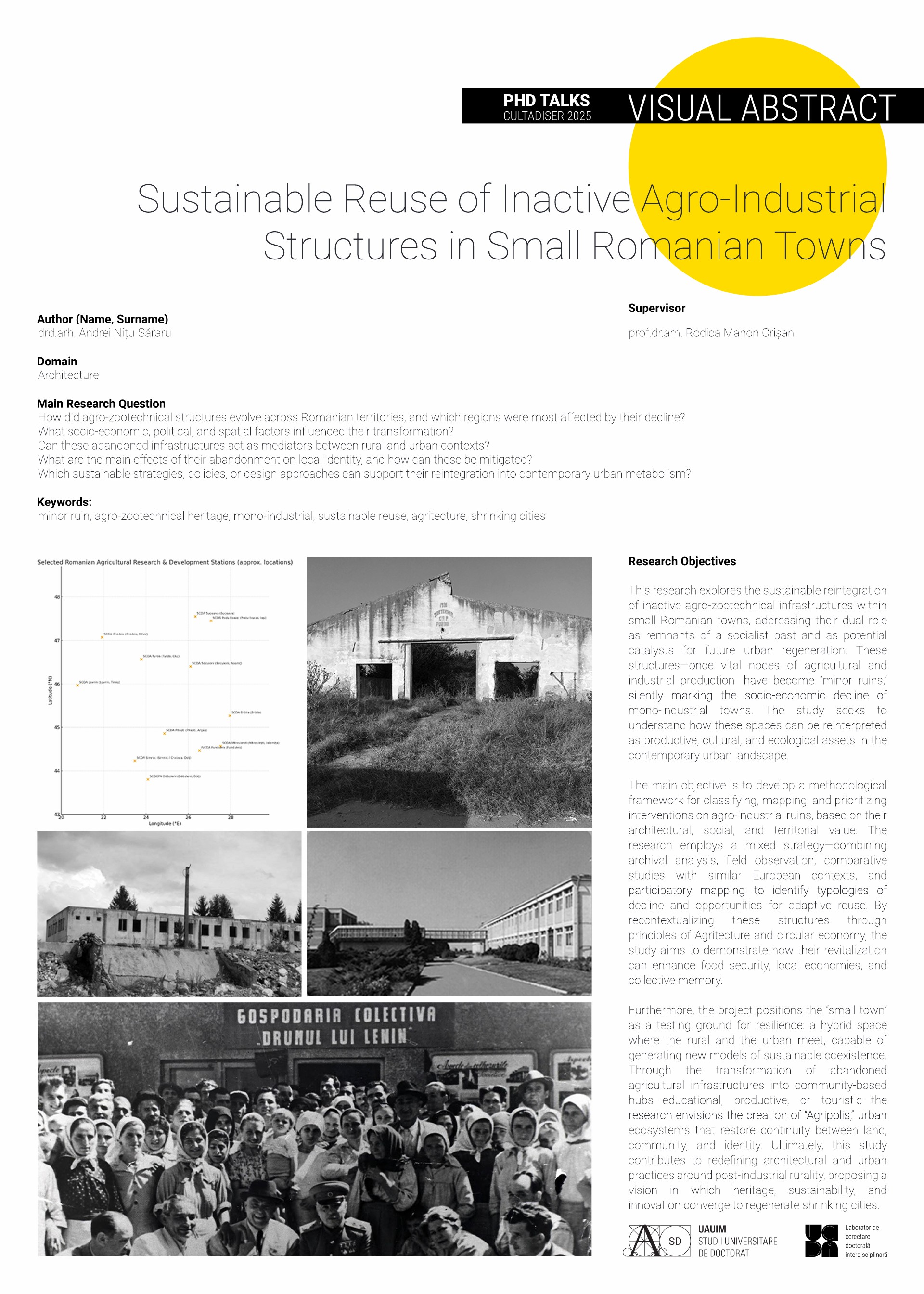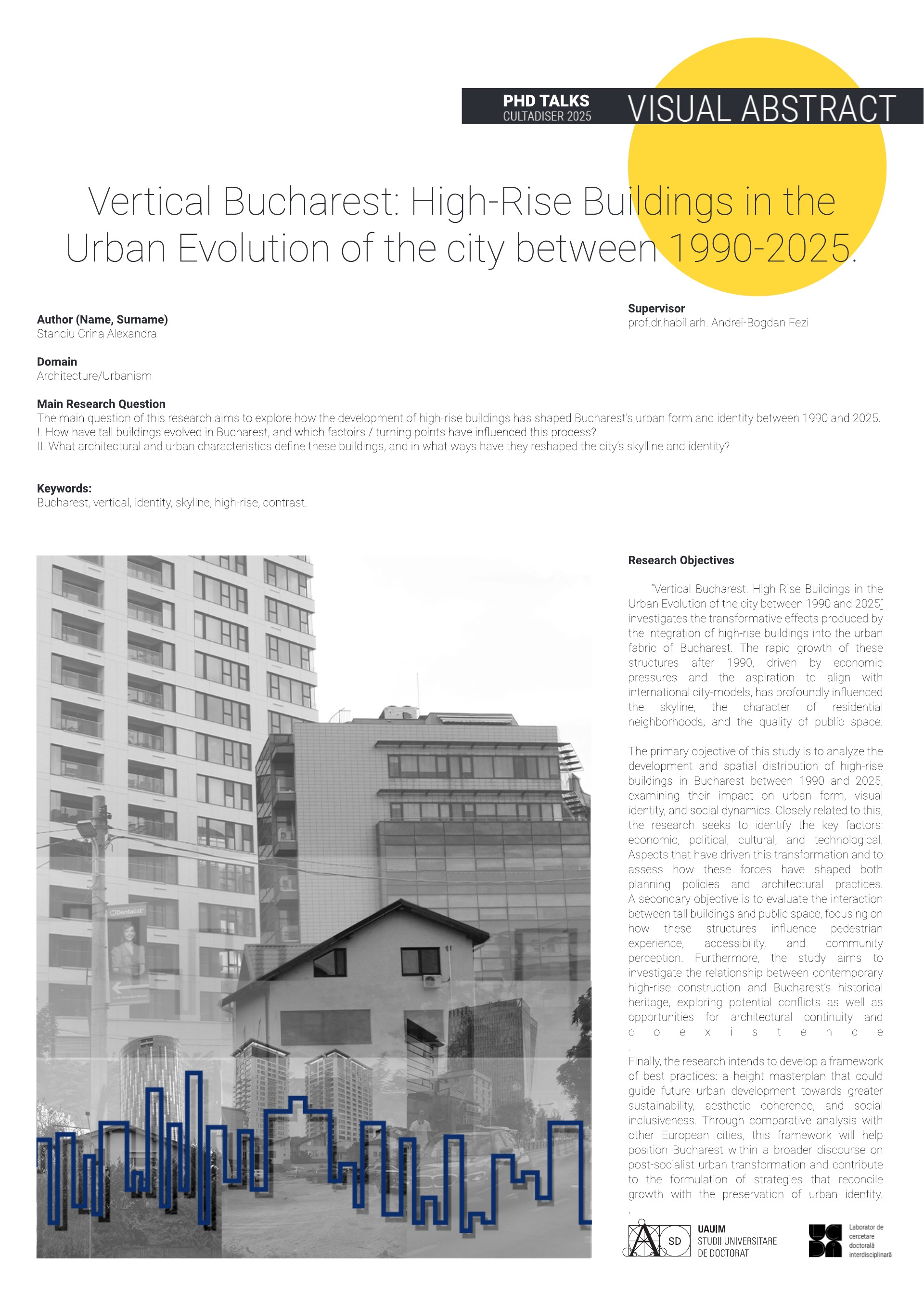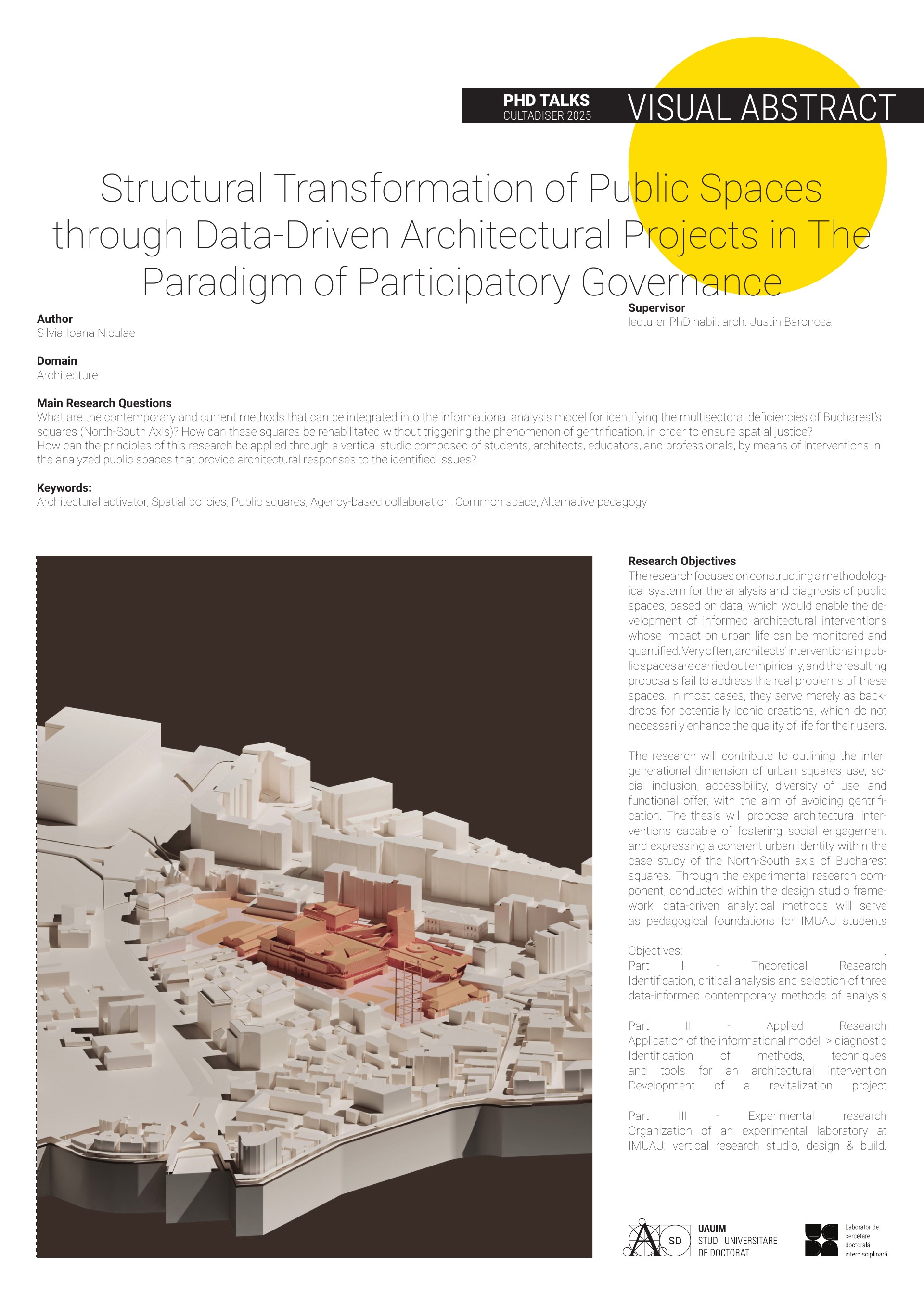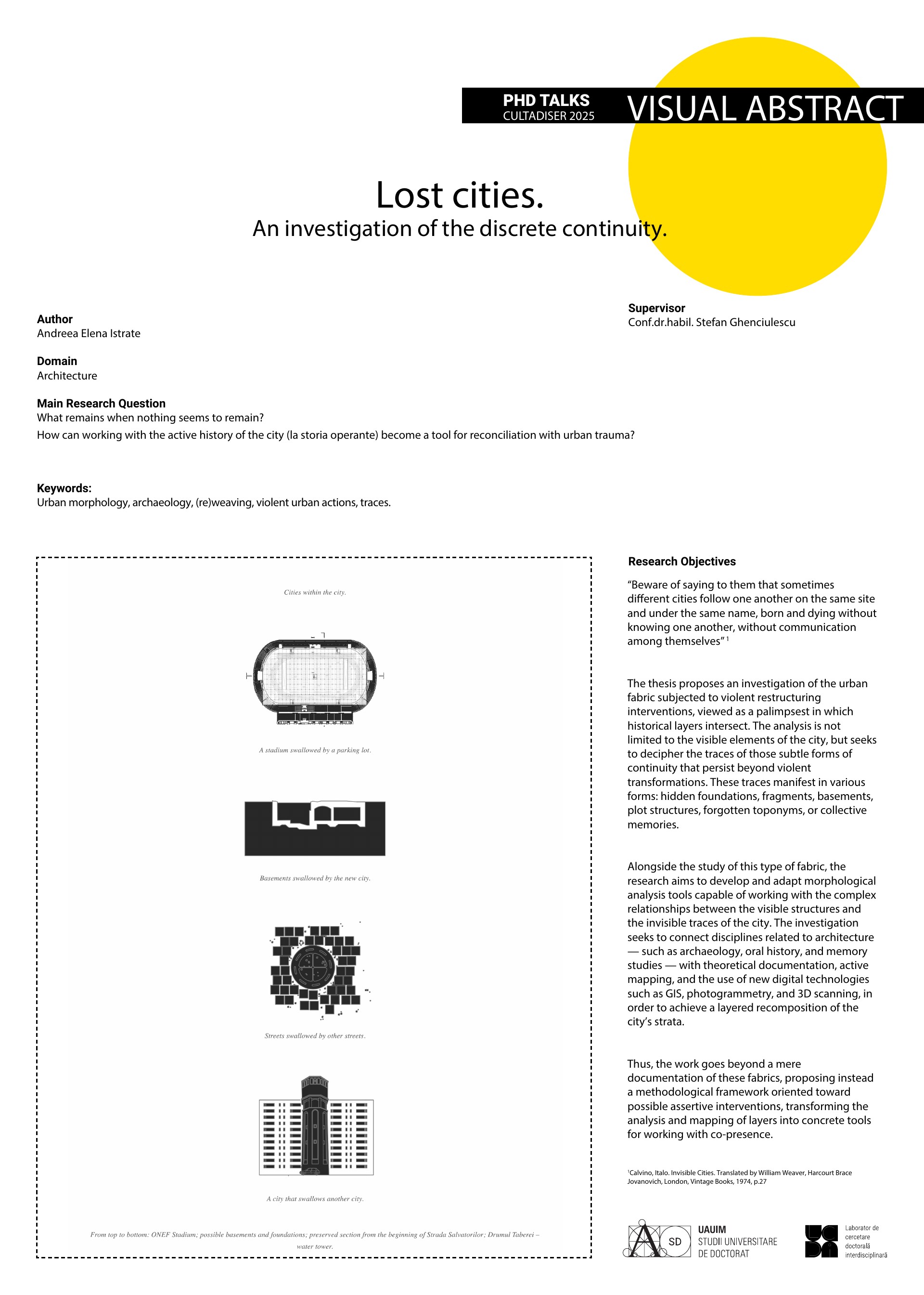 PhD Talks este organizat de Laboratorul de Cercetare Doctorală Interdisciplinară (LCDI), prin proiectul CULTADISER_CNFIS-FDI-2025-F-0040 – un cadru informal de dialog, sprijin și reflecție pentru cercetările doctorale în arhitectură și urbanism.
