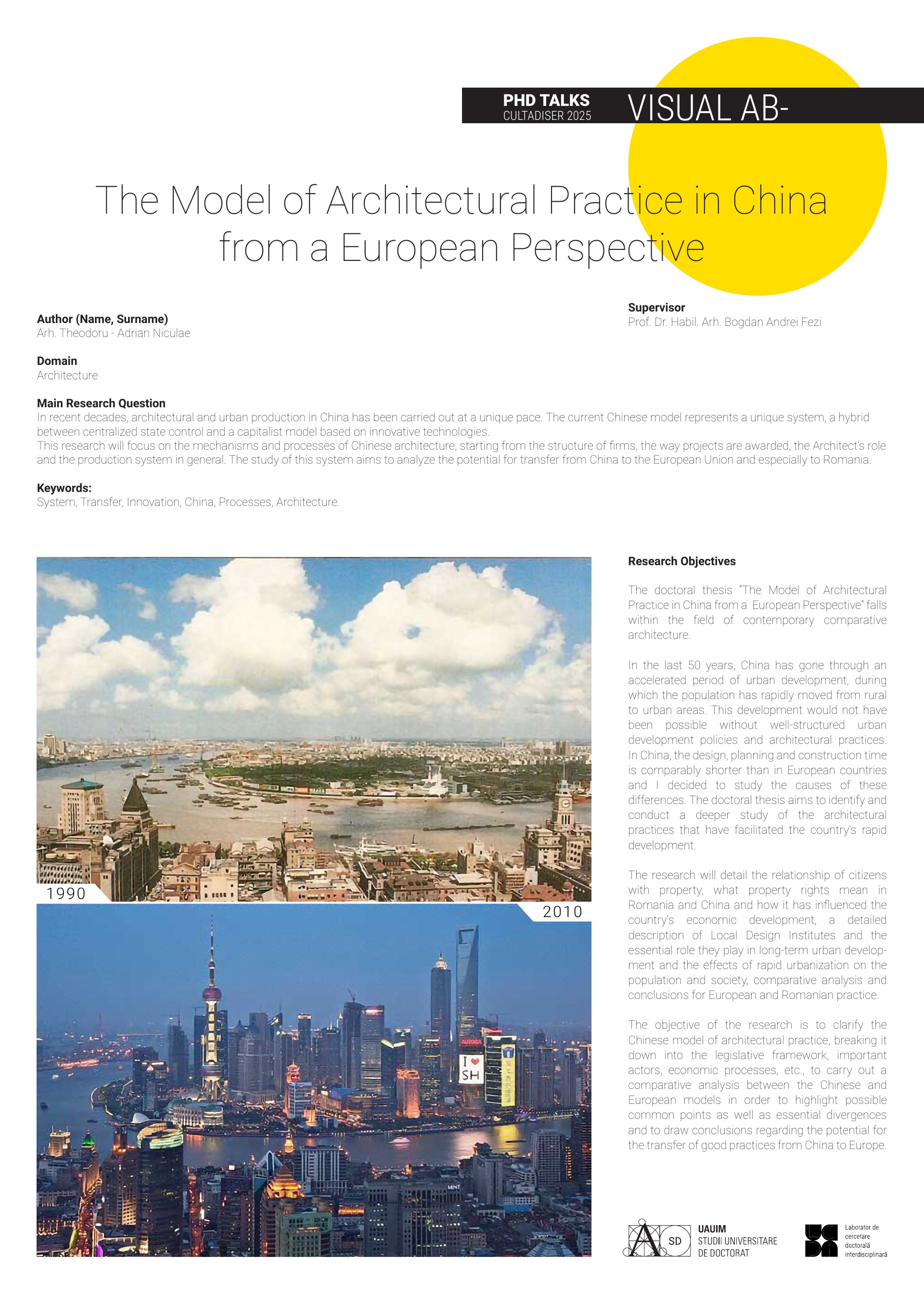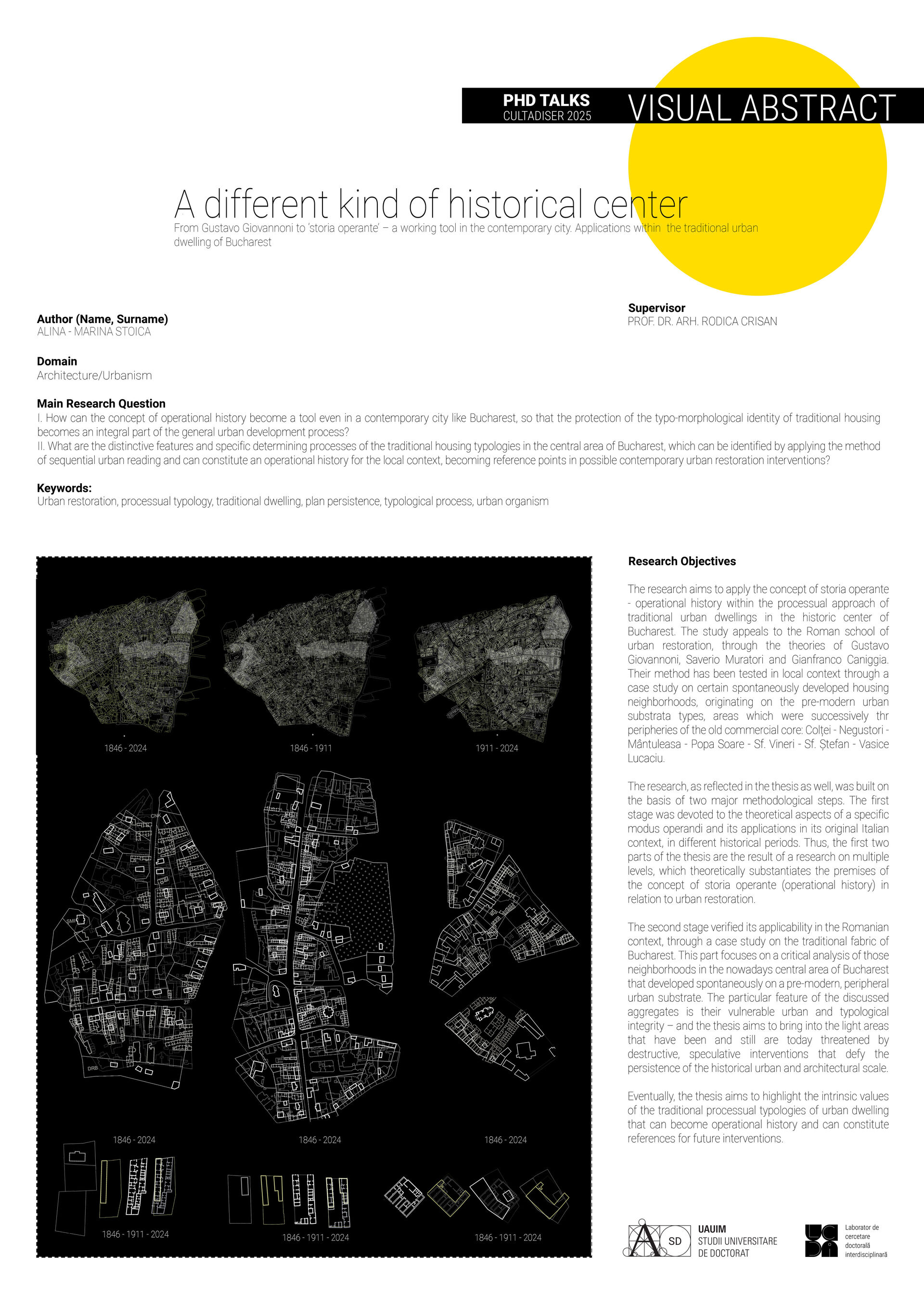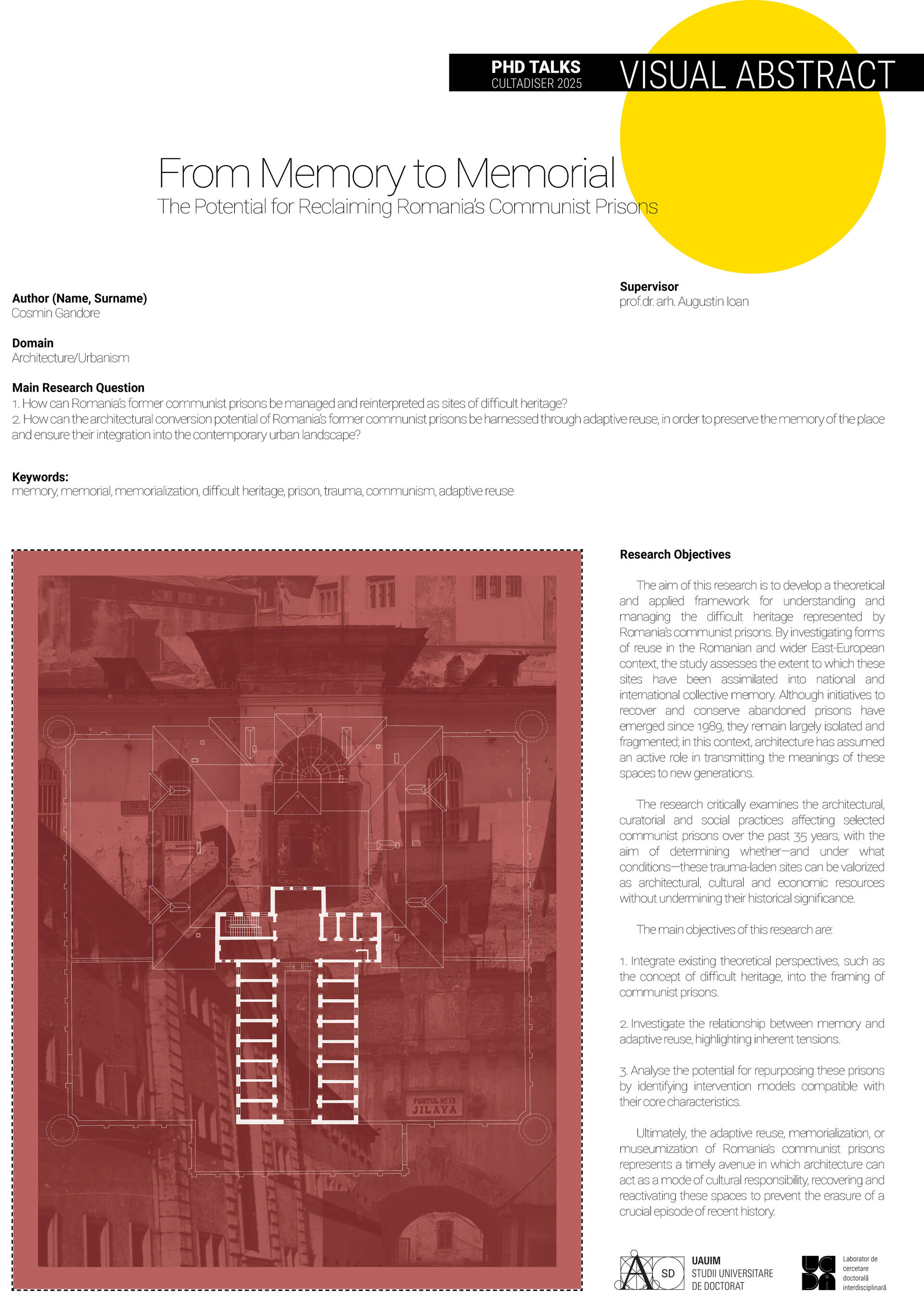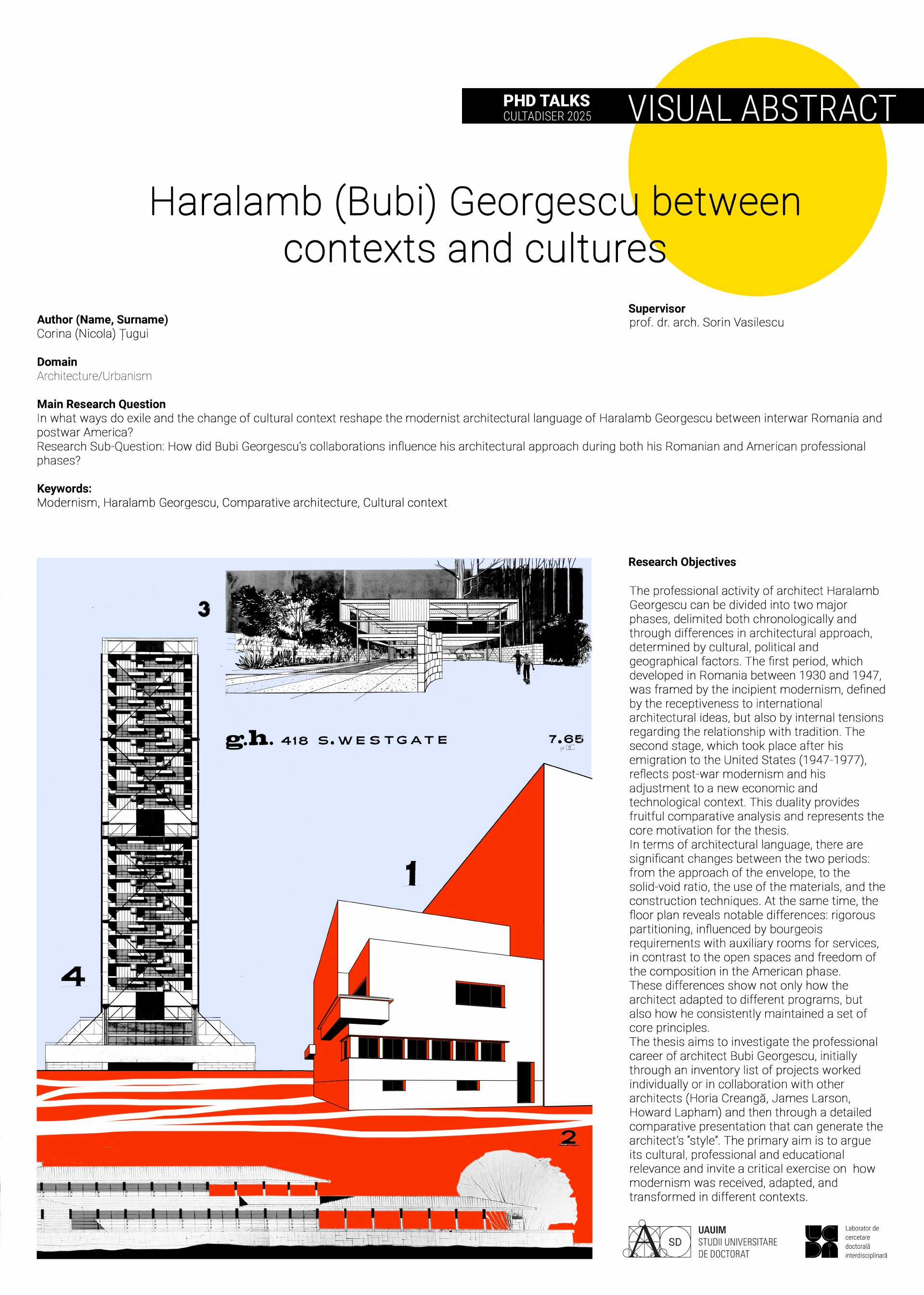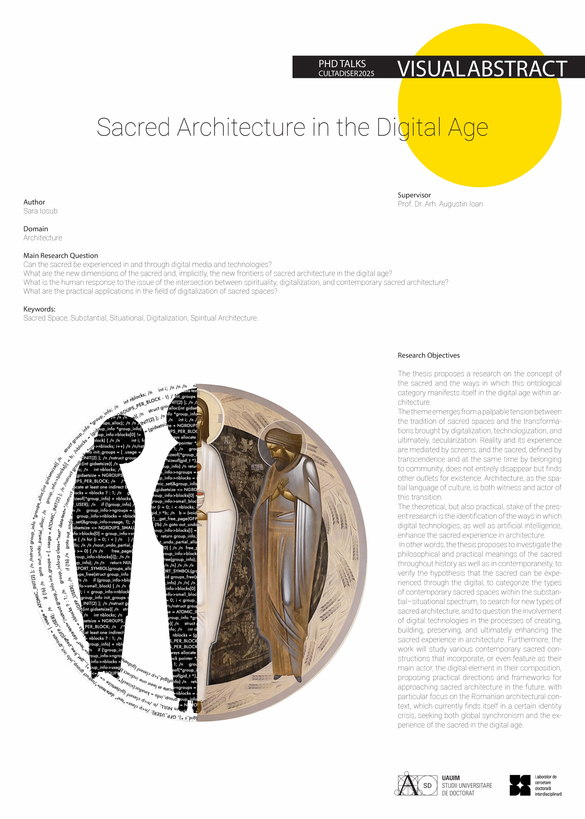 PhD Talks este organizat de Laboratorul de Cercetare Doctorală Interdisciplinară (LCDI), prin proiectul CULTADISER_CNFIS-FDI-2025-F-0040 – un cadru informal de dialog, sprijin și reflecție pentru cercetările doctorale în arhitectură și urbanism.