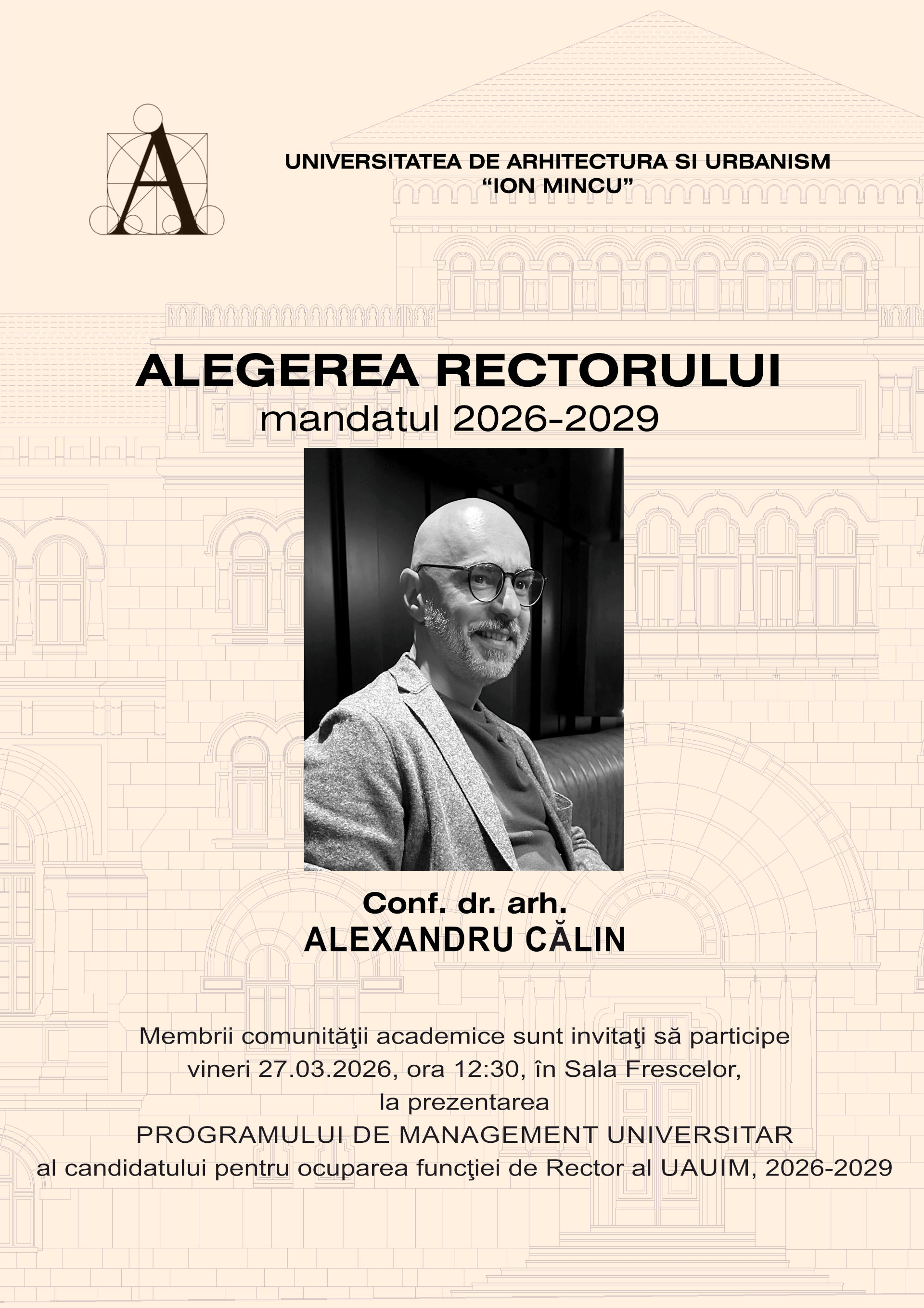 Membrii comunității academice sunt invitați să participe vineri 27 martie 2026, ora 12:30, în Sala Frescelor, la prezentarea programului de management universitar al candidatului pentru ocuparea funcției de Rector al UAUIM, 2026-2029, conf. dr. arh. Alexandru Călin.