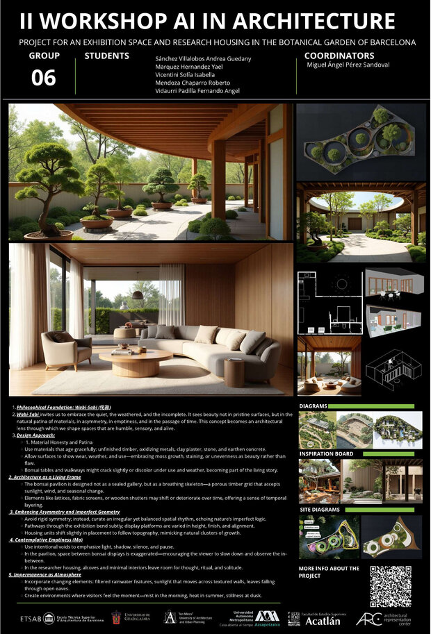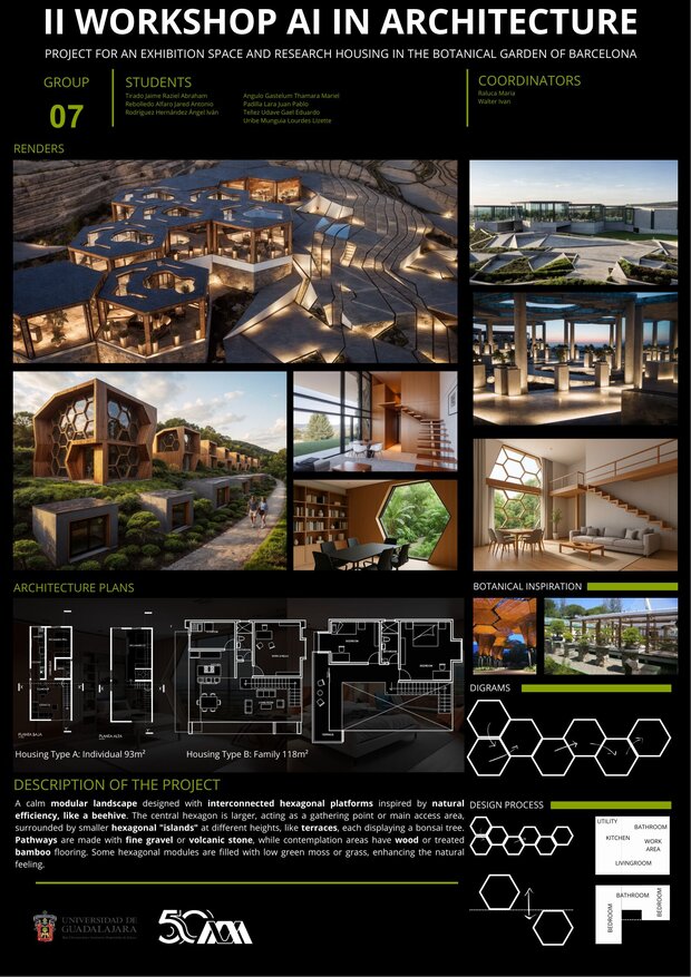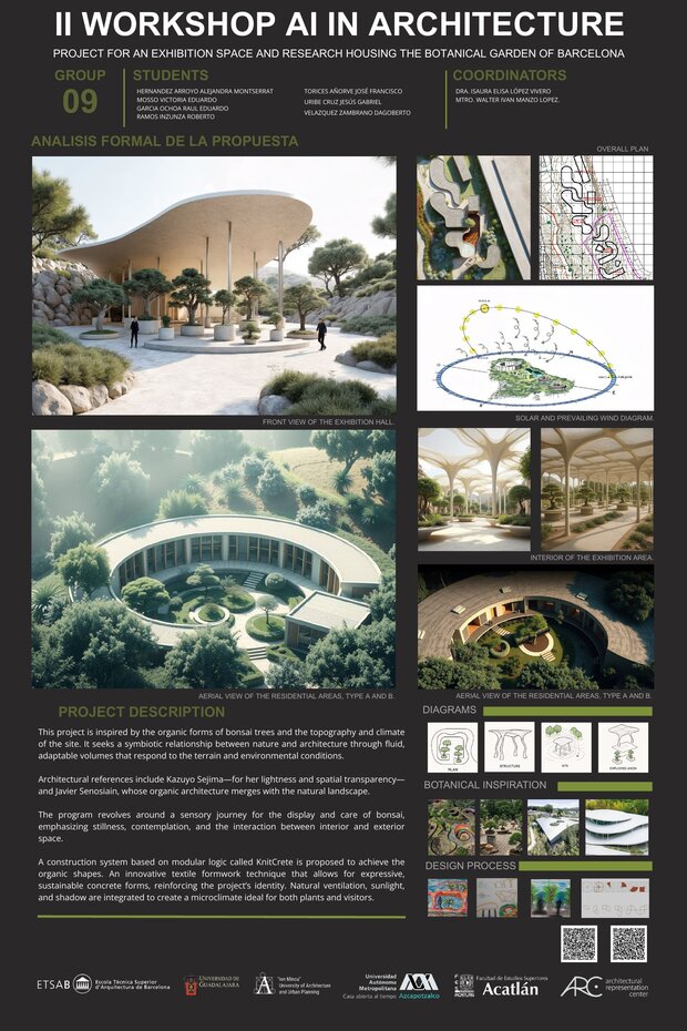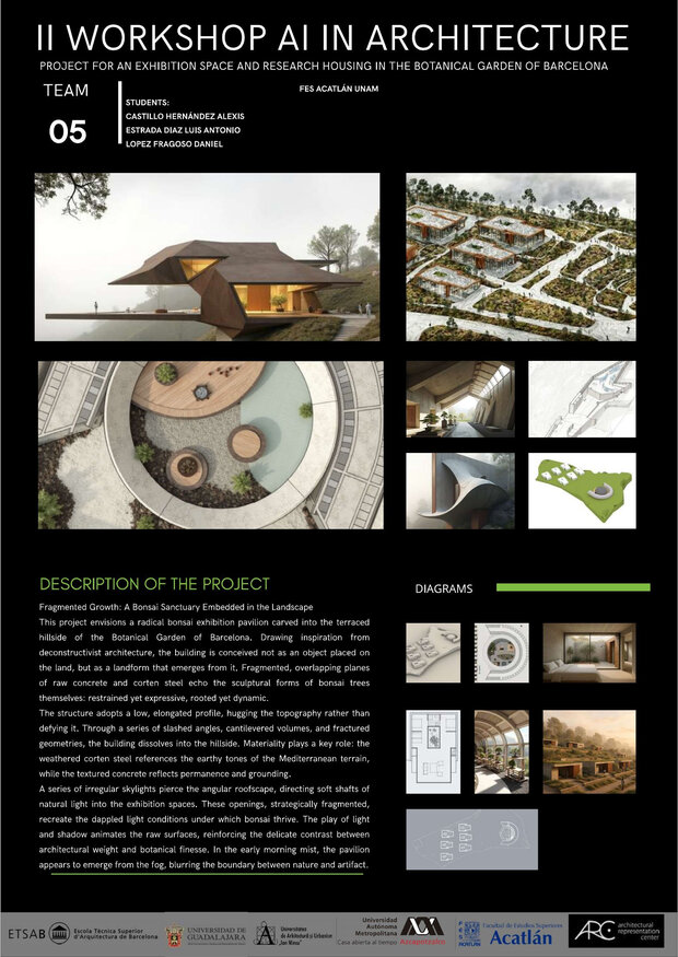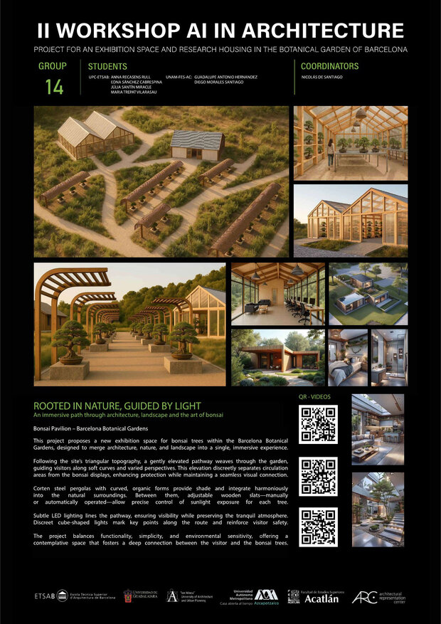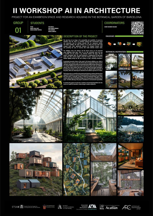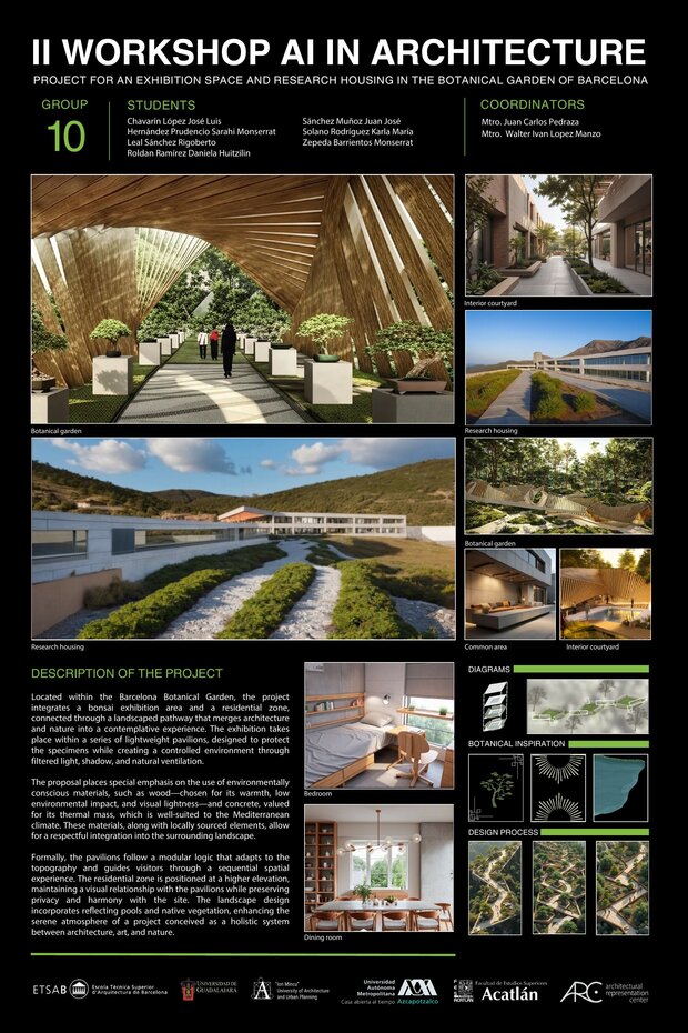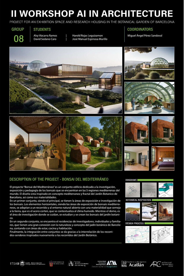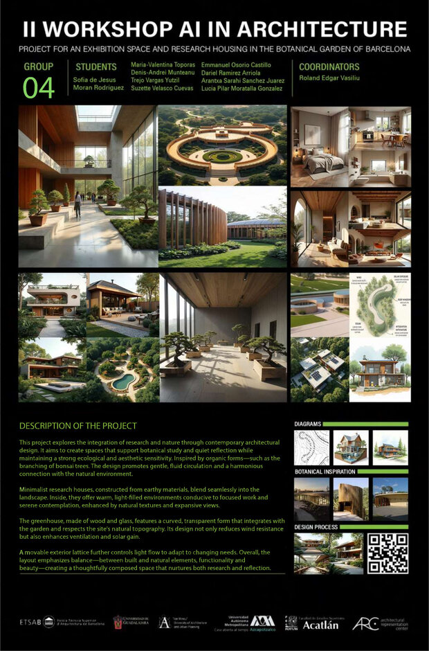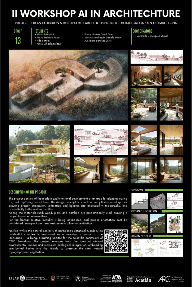 Al II-lea Workshop "AI în Arhitectură", organizat de Escuela Tecnica Superior de Arquitectura de Barcelona, în parteneriat cu UAUIM, cu participarea a 3 școli de arhitectură din Mexic (Universidad de Guadalajara, Universidad Autónoma Metropolitana de Azcapotzalco și Facultad de Estudios Superiores Acatlán) în mai 2025, s-a finalizat cu realizarea a nu mai puțin de 13 proiecte având ca temă organizarea unor construcții pavilionare pentru expunere și locuire pentru Grădina Botanică din Barcelona. Cei aproximativ 20 de studenți români participanți, reprezentând toate facultățile din cadrul UAUIM, au avut la dispoziție pentru activitatea desfășurată online spațiul Atelierului Experimental de Arhitectură "Mac Popescu" din sediul UAUIM. Proiectele realizate cu ajutorul mai multor programe de grafică AI aplicată în arhitectură (LookX, Leonardo, Midjourney, Runaway, Gamma, Dream AI etc.) însă cu viziuni cât se poate de originale, oferind de la viziunea unor structuri usoare, parametrice, din metal sau lemn, cu acoperire de sticlă (echipele 3,8,10), la intervenții peisagere de arhitectură ce se contopește cu natura prin relația cu terenul și materialele folosite (echipele 4,5,6,9,13), la intervenții pavilionare bazate pe modulul repetitiv al locuinței (echipele 2, 8, 11), la structuri de inspirație bionică – fagurele de albine (echipa 7) sau construcții ce reeditează franc arhitectura serelor (echipele 1, 12).