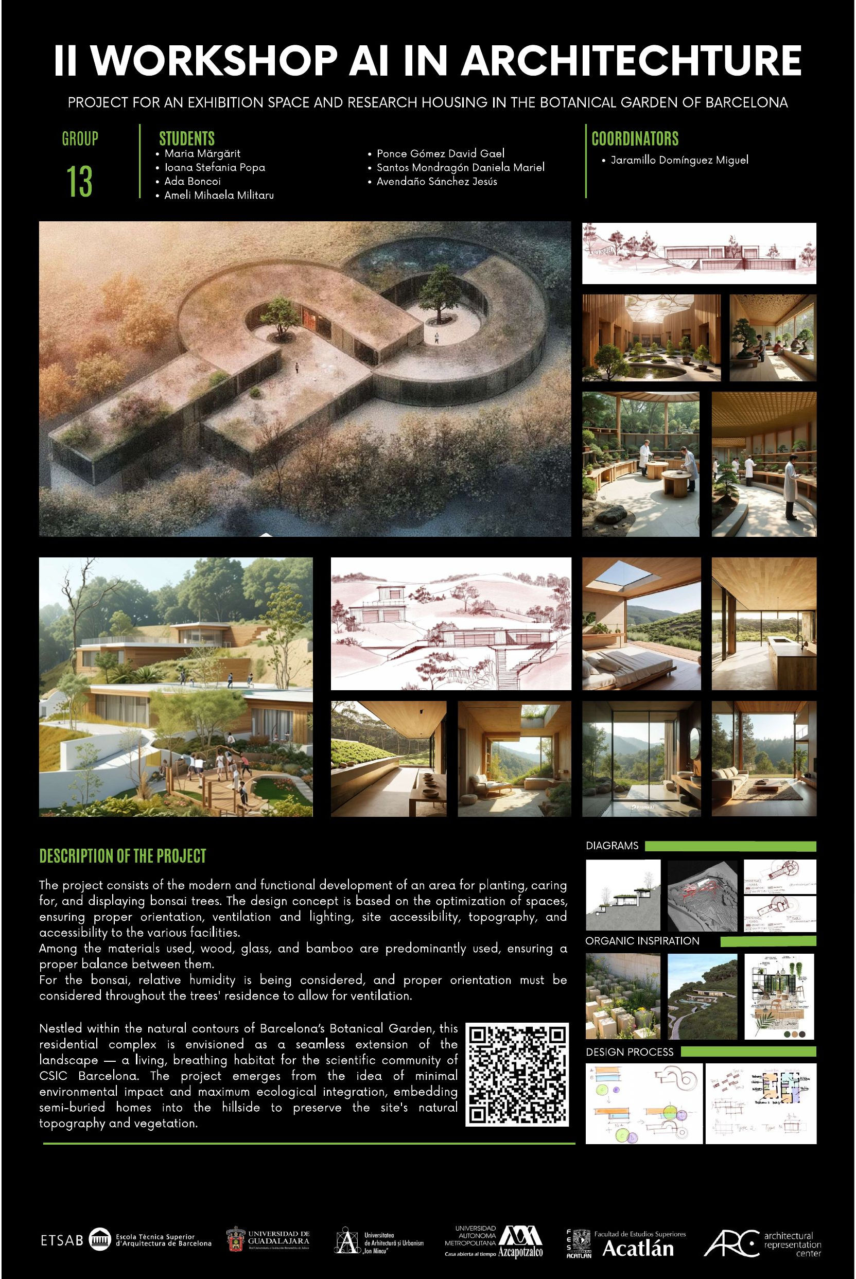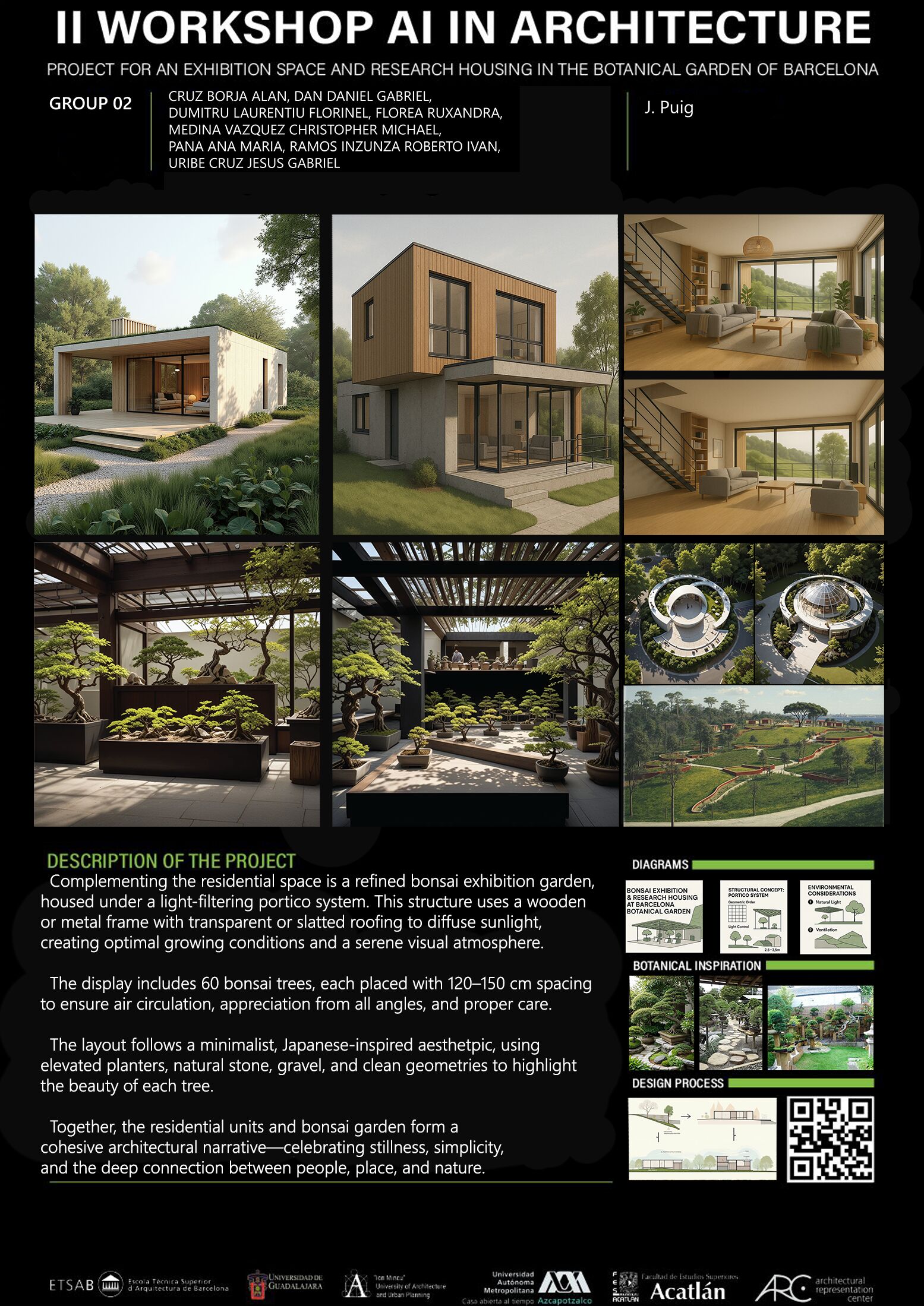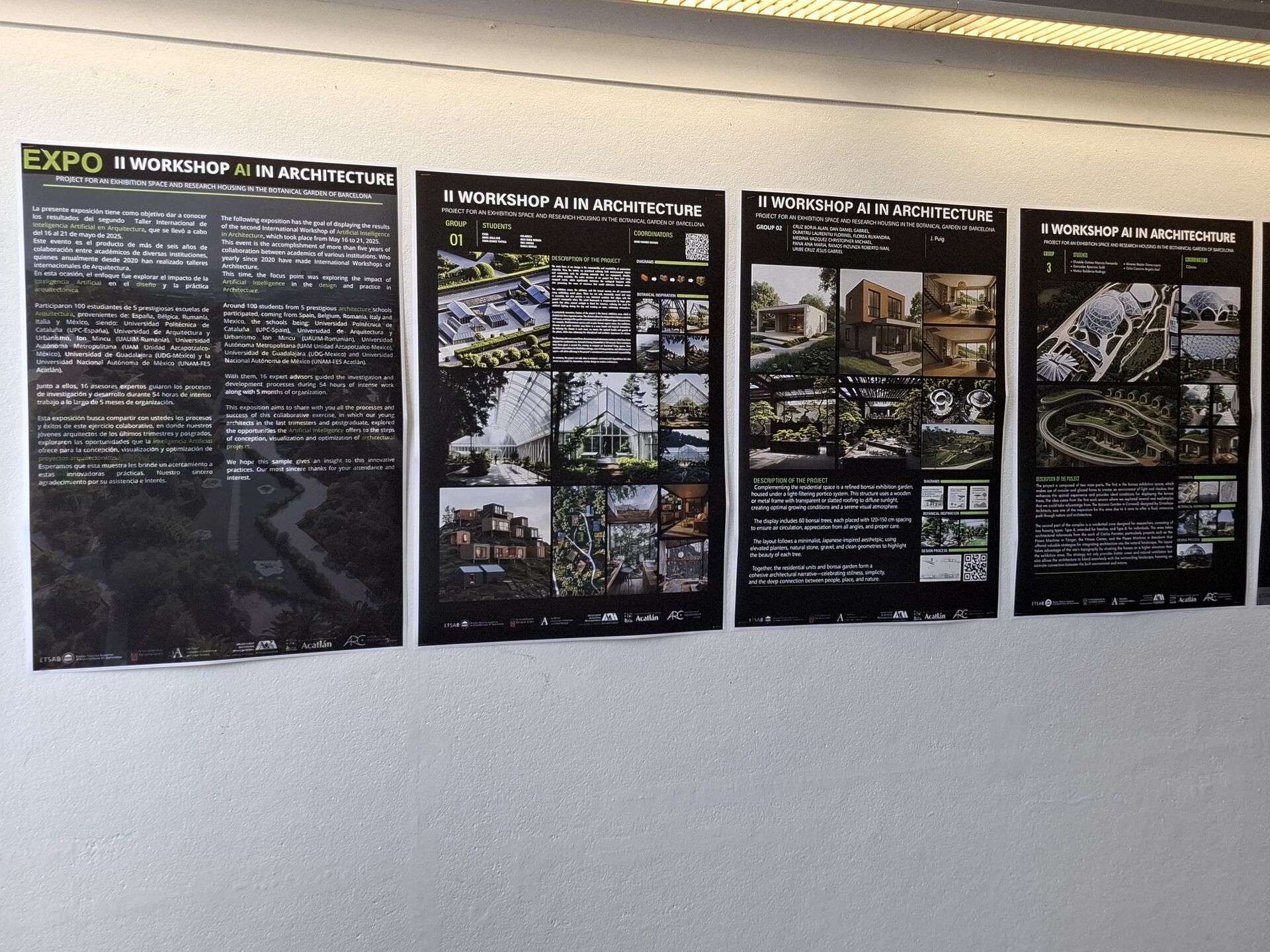 Al II-lea Workshop "AI în Arhitectură", organizat de Escuela Tecnica Superior de Arquitectura de Barcelona, în parteneriat cu UAUIM, cu participarea a 3 școli de arhitectură din Mexic (Universidad de Guadalajara, Universidad Autónoma Metropolitana de Azcapotzalco și Facultad de Estudios Superiores Acatlán) în mai 2025, s-a finalizat cu realizarea a nu mai puțin de 13 proiecte având ca temă organizarea unor construcții pavilionare pentru expunere și locuire pentru Grădina Botanică din Barcelona. Cei aproximativ 20 de studenți români participanți, reprezentând toate facultățile din cadrul UAUIM, au avut la dispoziție pentru activitatea desfășurată online spațiul Atelierului Experimental de Arhitectură "Mac Popescu" din sediul UAUIM. Proiectele realizate cu ajutorul mai multor programe de grafică AI aplicată în arhitectură (LookX, Leonardo, Midjourney, Runaway, Gamma, Dream AI etc.) însă cu viziuni cât se poate de originale, oferind de la viziunea unor structuri usoare, parametrice, din metal sau lemn, cu acoperire de sticlă (echipele 3,8,10), la intervenții peisagere de arhitectură ce se contopește cu natura prin relația cu terenul și materialele folosite (echipele 4,5,6,9,13), la intervenții pavilionare bazate pe modulul repetitiv al locuinței (echipele 2, 8, 11), la structuri de inspirație bionică – fagurele de albine (echipa 7) sau construcții ce reeditează franc arhitectura serelor (echipele 1, 12).