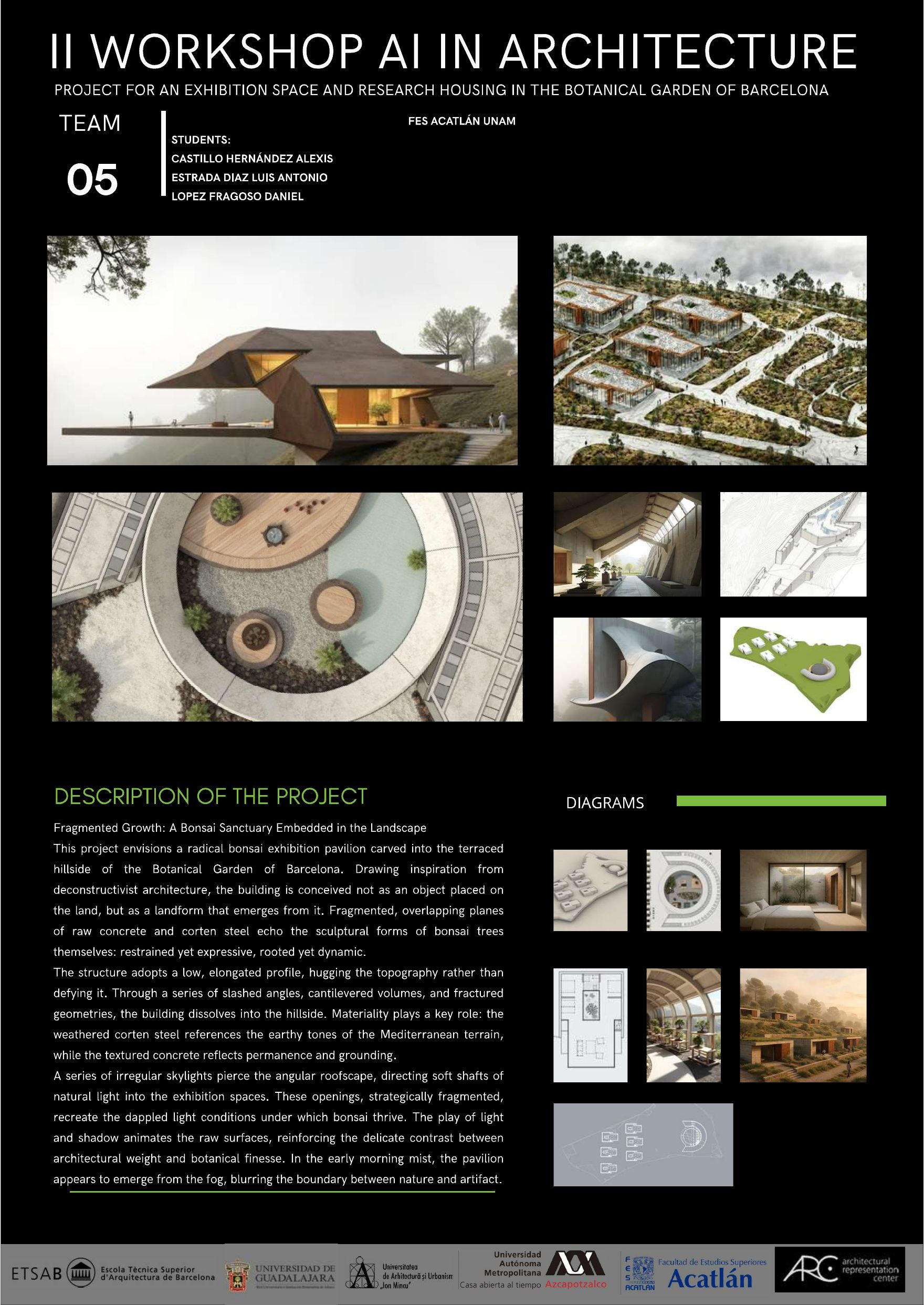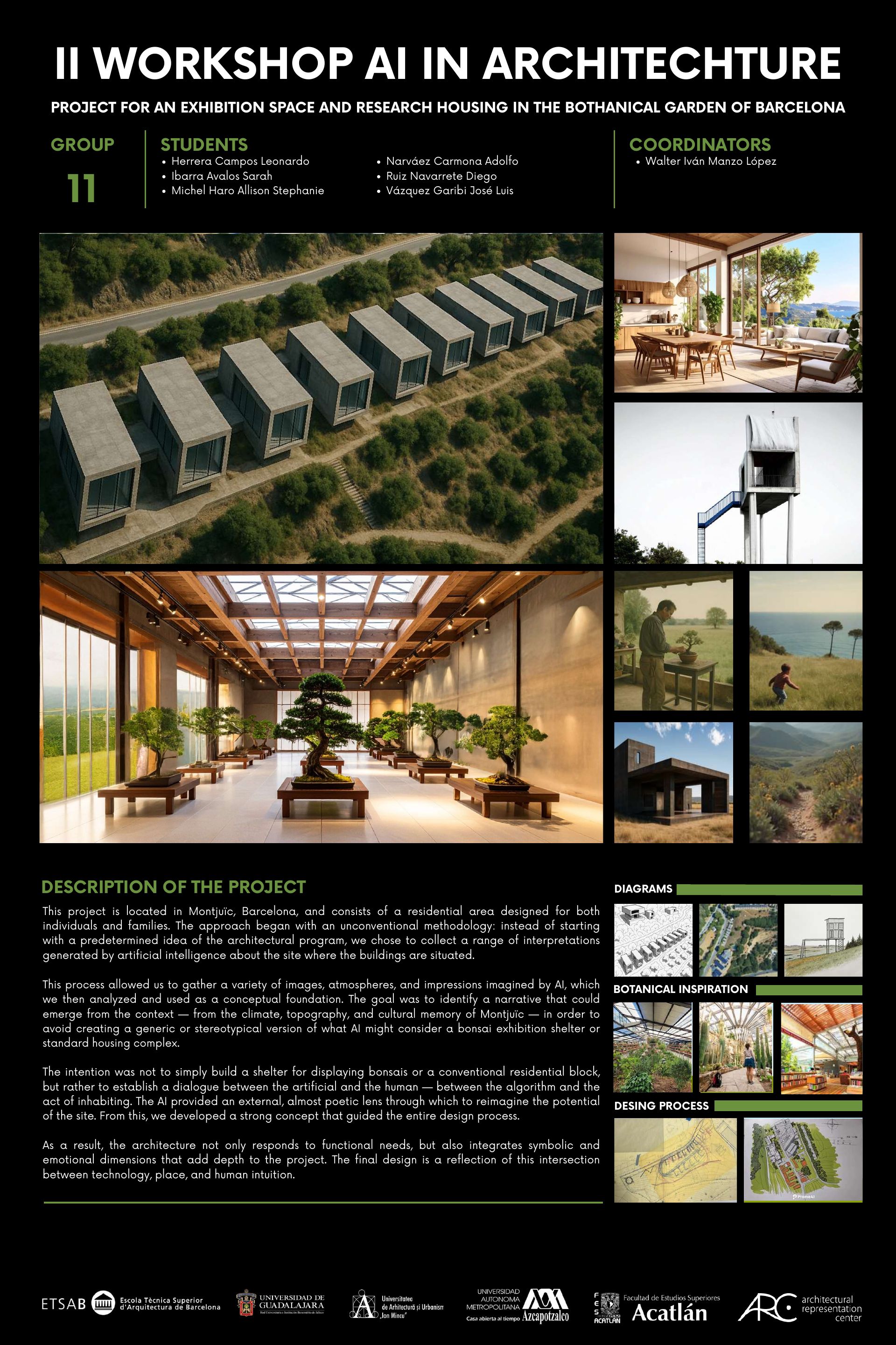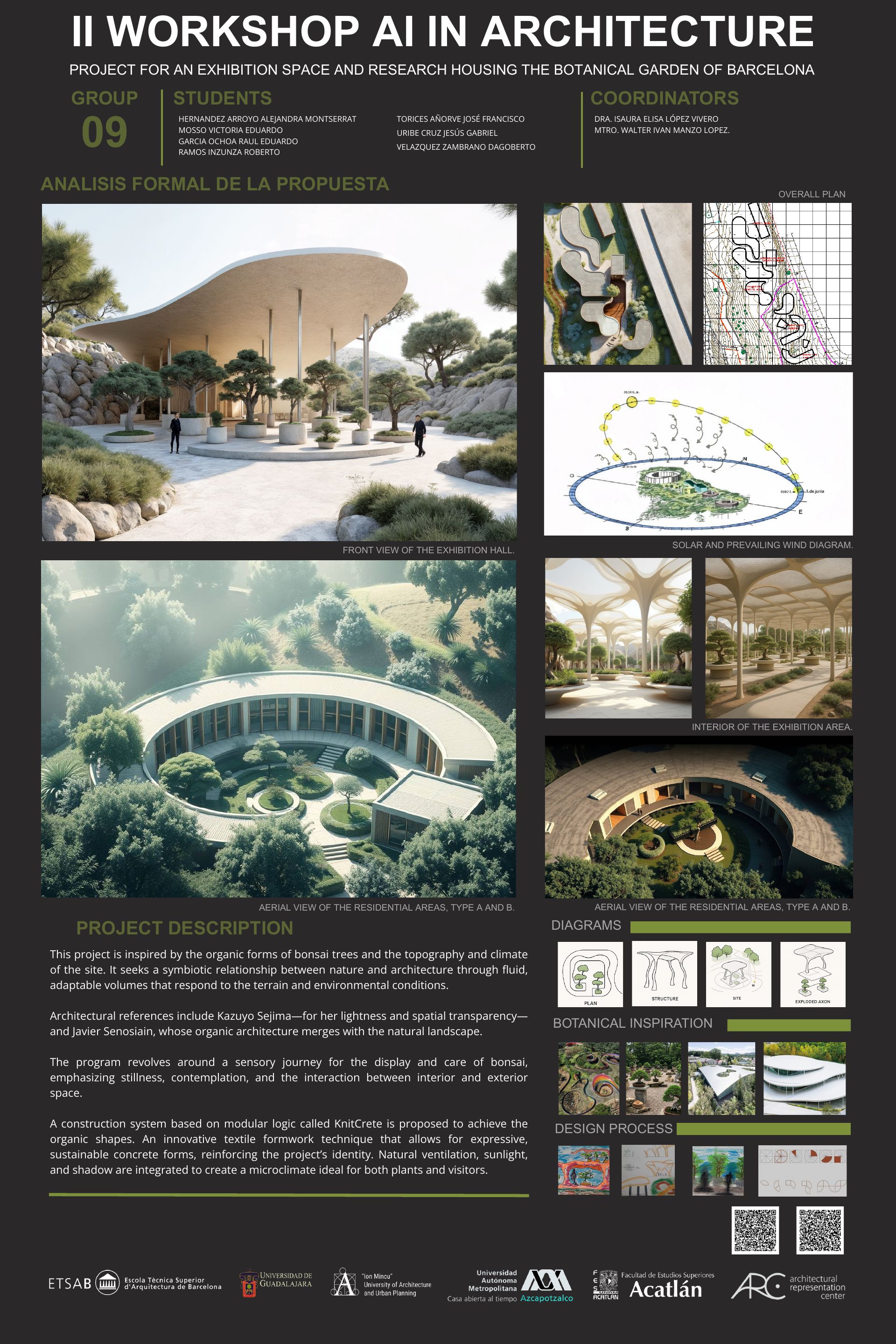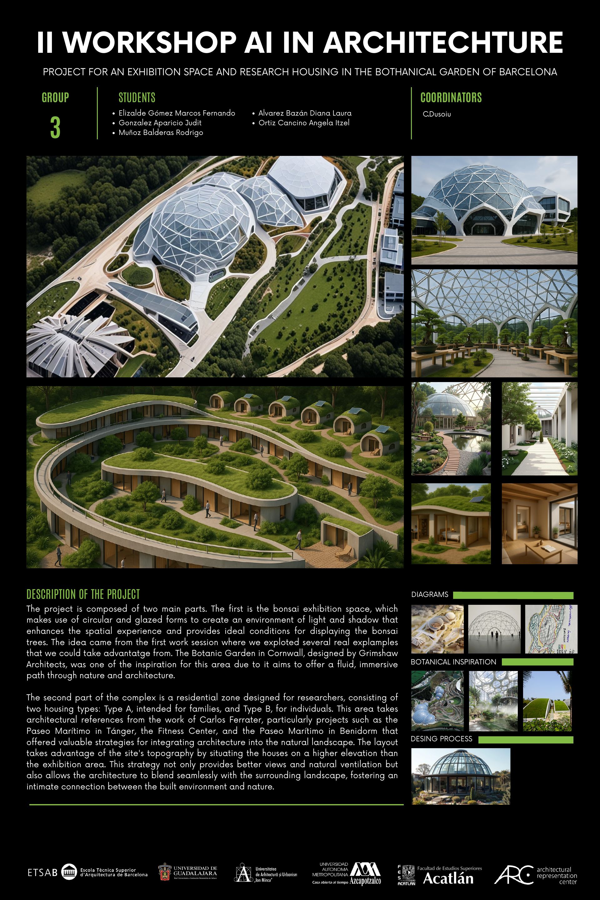 Al II-lea Workshop "AI în Arhitectură", organizat de Escuela Tecnica Superior de Arquitectura de Barcelona, în parteneriat cu UAUIM, cu participarea a 3 școli de arhitectură din Mexic (Universidad de Guadalajara, Universidad Autónoma Metropolitana de Azcapotzalco și Facultad de Estudios Superiores Acatlán) în mai 2025, s-a finalizat cu realizarea a nu mai puțin de 13 proiecte având ca temă organizarea unor construcții pavilionare pentru expunere și locuire pentru Grădina Botanică din Barcelona. Cei aproximativ 20 de studenți români participanți, reprezentând toate facultățile din cadrul UAUIM, au avut la dispoziție pentru activitatea desfășurată online spațiul Atelierului Experimental de Arhitectură "Mac Popescu" din sediul UAUIM. Proiectele realizate cu ajutorul mai multor programe de grafică AI aplicată în arhitectură (LookX, Leonardo, Midjourney, Runaway, Gamma, Dream AI etc.) însă cu viziuni cât se poate de originale, oferind de la viziunea unor structuri usoare, parametrice, din metal sau lemn, cu acoperire de sticlă (echipele 3,8,10), la intervenții peisagere de arhitectură ce se contopește cu natura prin relația cu terenul și materialele folosite (echipele 4,5,6,9,13), la intervenții pavilionare bazate pe modulul repetitiv al locuinței (echipele 2, 8, 11), la structuri de inspirație bionică – fagurele de albine (echipa 7) sau construcții ce reeditează franc arhitectura serelor (echipele 1, 12).