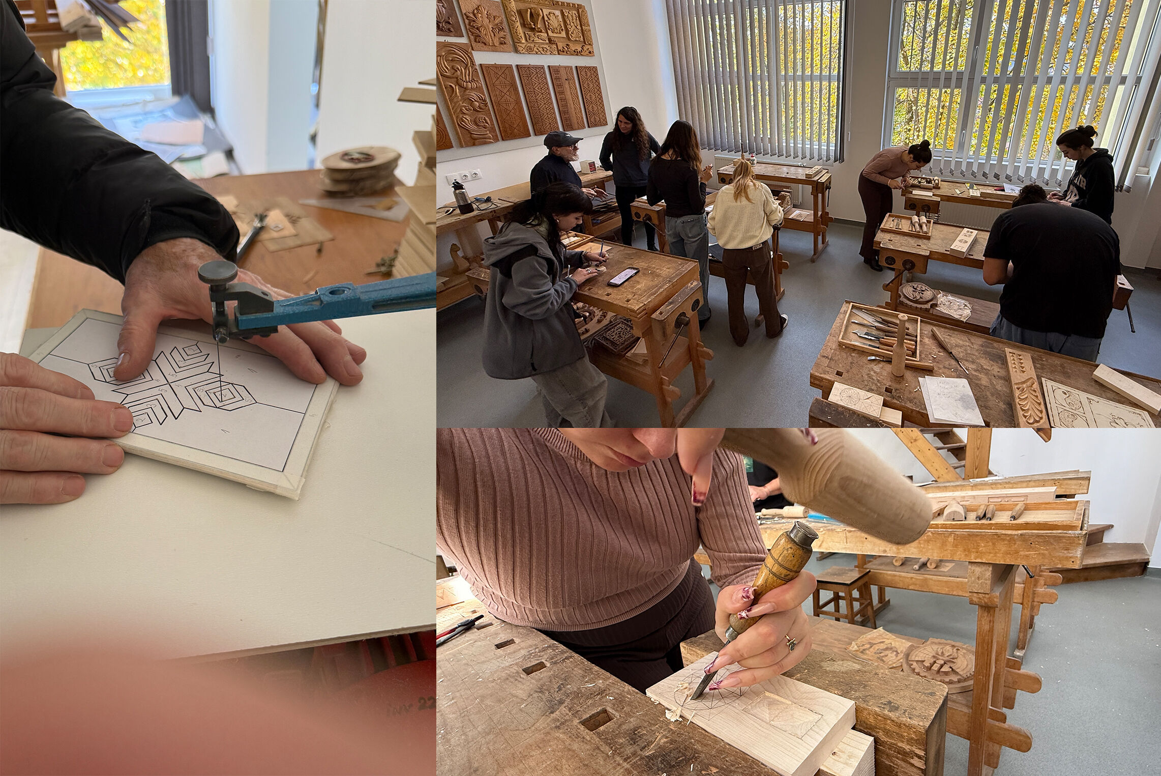 Cea de-a treia zi a adus finalizarea piesei de mobilier realizate în atelier și un exercițiu creativ de sculptură și intarsie în lemn, studenții realizând o piesă decorativă de mobilier după un model de studiu propus de coordonatori.